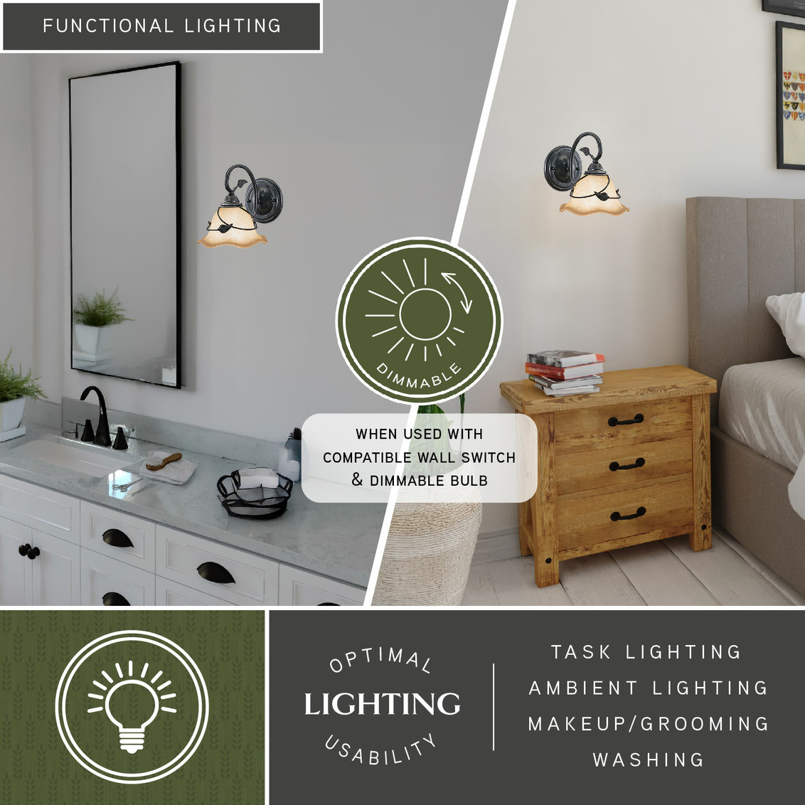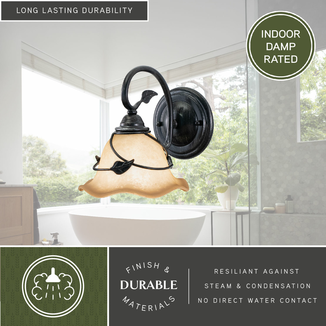 Bring a little of the outdoors inside with the Vine collection. Inspired by nature, this rustic collection features a dark oil shale finish. The amber flake glass shades are scalloped softening the overall feel. Elegantly curved arms are sprinkled with delicately crafted leaves completing the look. This full family of fixtures has something for every room in your home. Versatile reversible mounting option lets you install this fixture up or down. This wall sconce is ideal for bathrooms, hallways, stairways, and foyers.