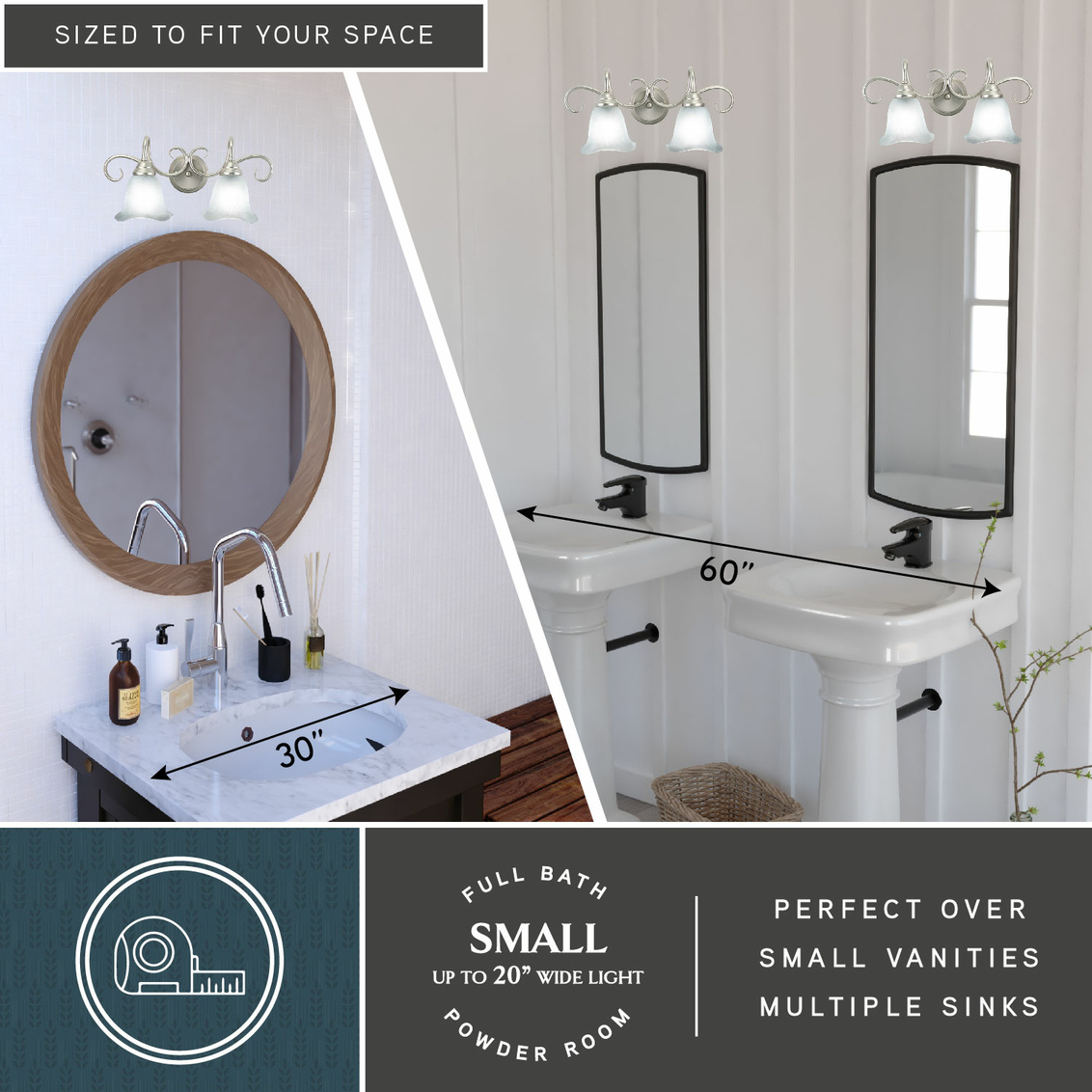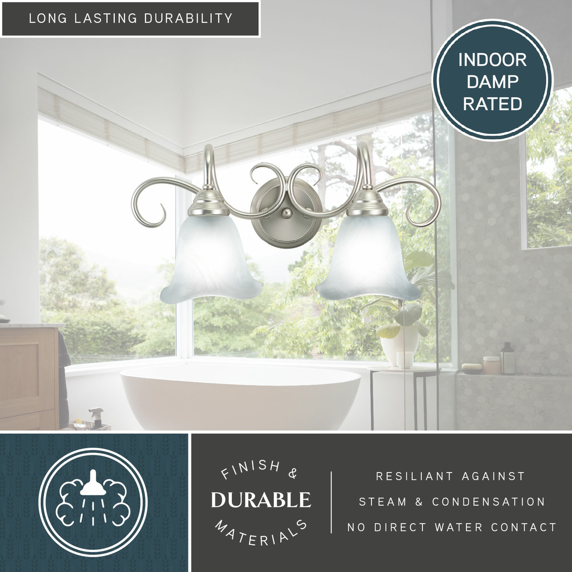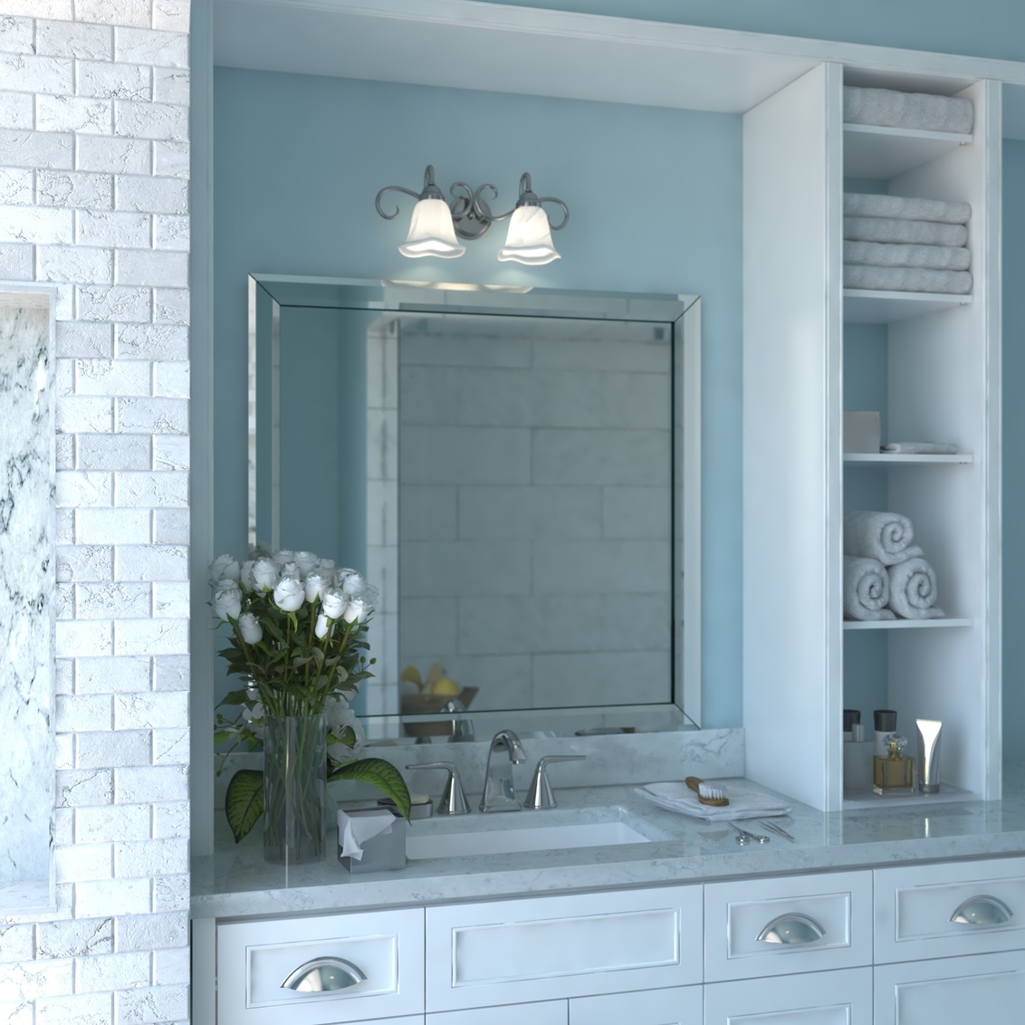The Bella collection features a brushed nickel finish with white alabaster glass shades. The shades are delicately scalloped softening the... Show more