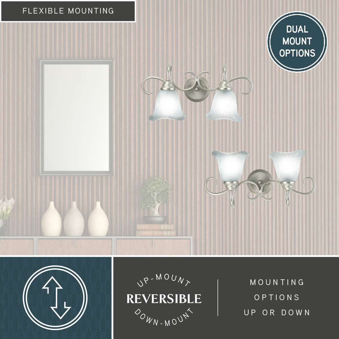 The Bella collection features a brushed nickel finish with white alabaster glass shades. The shades are delicately scalloped softening the overall feel. Elegantly scrolled arms complete the look of this transitional family of fixtures. This fixture may be mounted up or down. Choose from a variety of sizes for the perfect fit in your space.