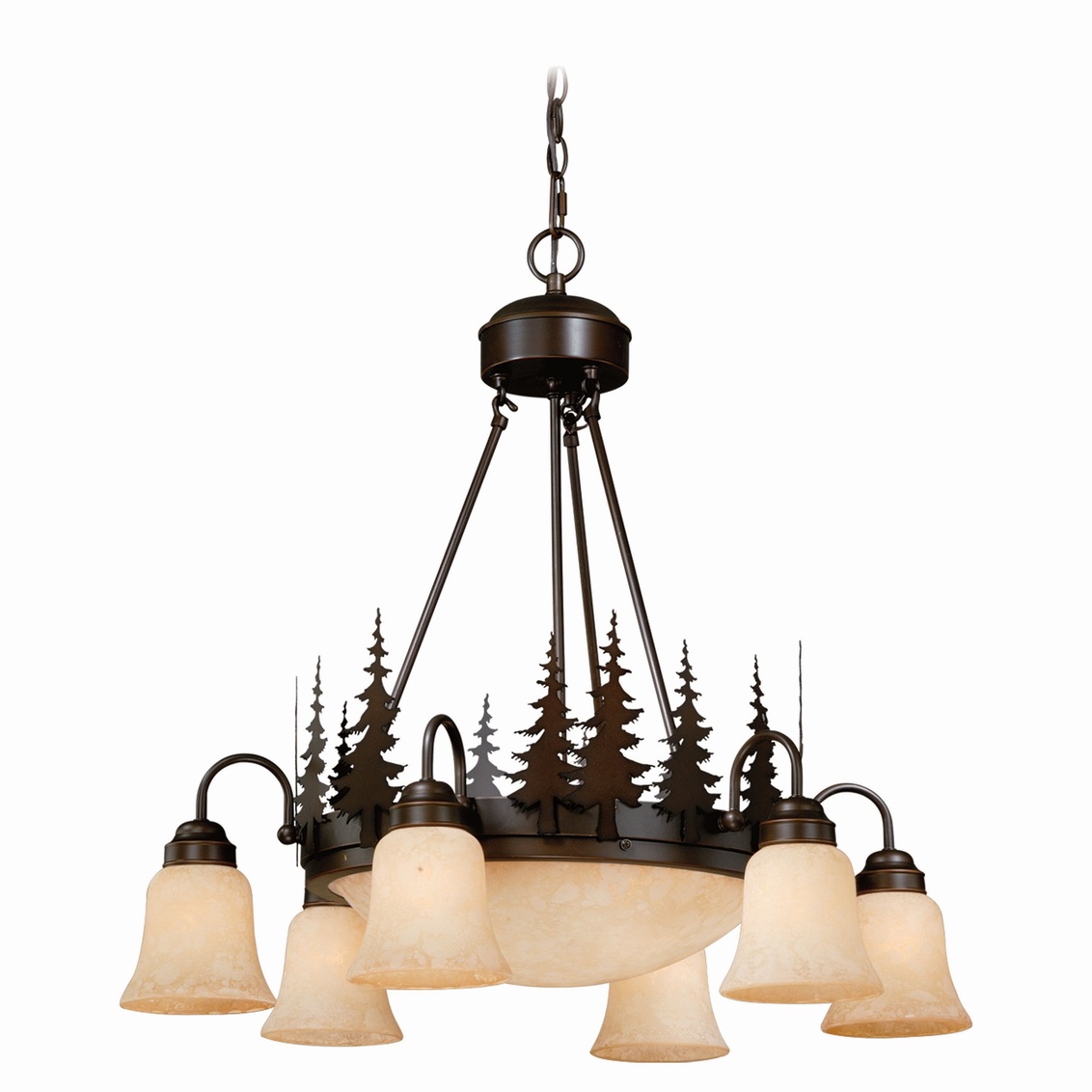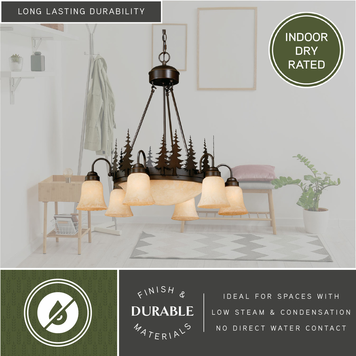 Evoking the spirit of the wilderness, this rustic themed light is clad in a burnished bronze finish and features silhouetted tree imagery atop glowing amber flake glass. It is a great choice for a vacation lodge, cabin or suburban home and will complement a variety of home styles: anywhere you want to bring an element of nature. This chandelier is ideal for kitchens, dining areas, and foyers.