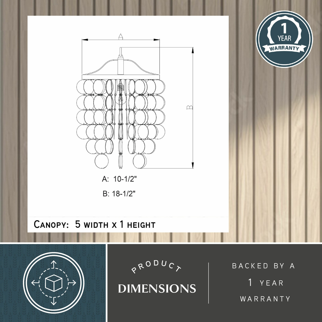 Soft contemporary styling combined with texture and iridescence. The Elsa collection pendant is a unique option for use above an eating area, or (in multiples above) an elongated island, or to accent a small room or foyer space. Tiers of hand-strung natural Capiz shells create a soft diffused light that perfectly compliments the satin nickel metal elements. This is a full collection with coordinating pieces to decorate any room in the house. Features medium screw base lamping; frosted bulb recommended for best appearance.