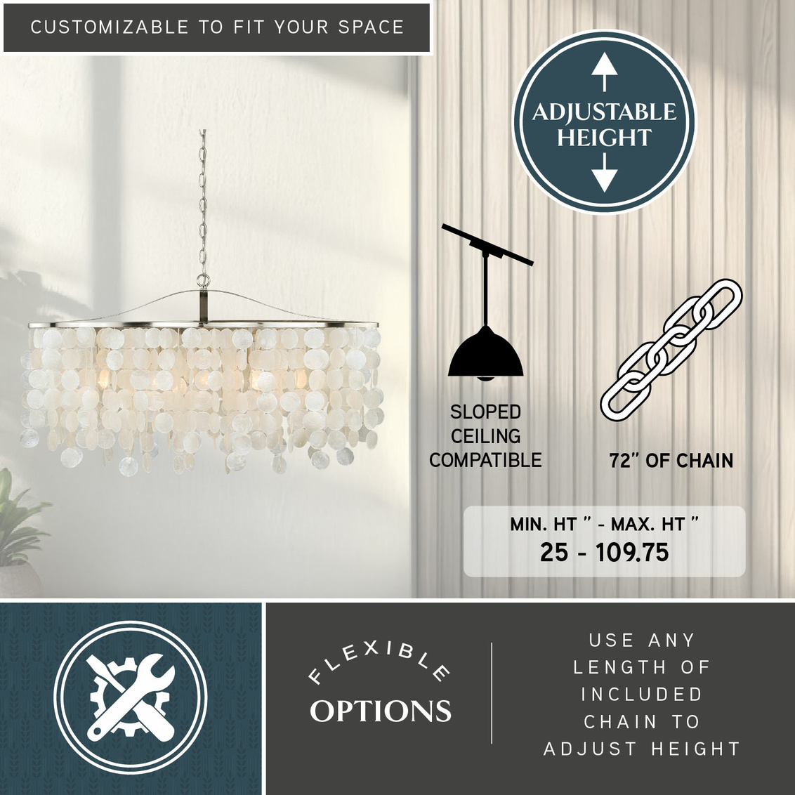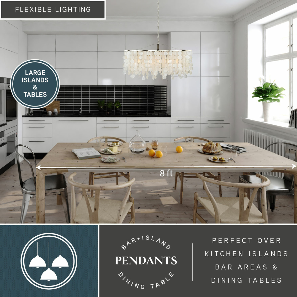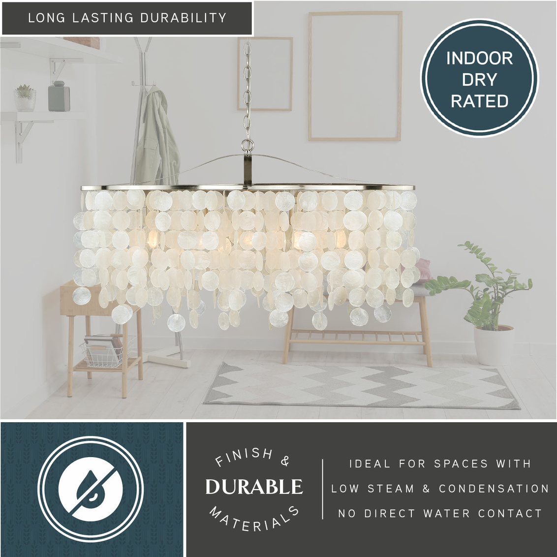 Soft contemporary styling combined with texture and iridescence. The Elsa collection 5 light oval island pendant light is a unique option to lighten and liven up the space above an elongated dining table or kitchen island. Tiers of hand-strung natural capiz shells create a soft diffused light that perfectly compliments the satin nickel metal elements. This is a full collection with coordinating pieces to decorate any room in the house.