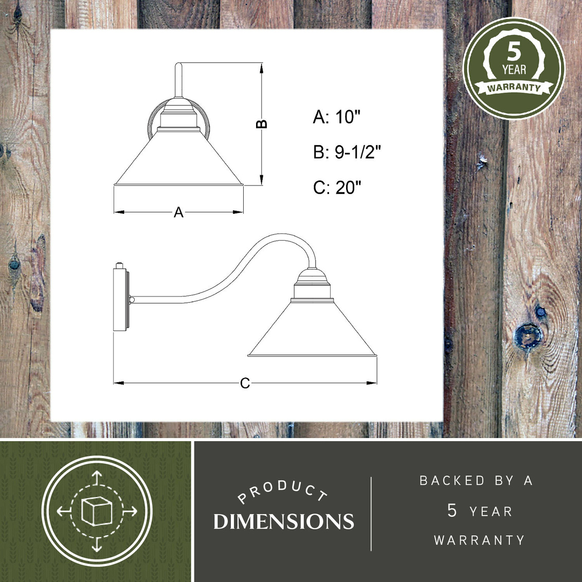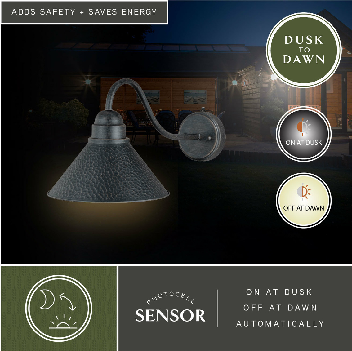 Designed with stately, yet rustic sophistication, the Outland collection is a solid choice for your outdoor space. The finish gives this barn light a warm and inviting elegance, and the finish inside the shade adds to the charm. This fixture is dark-sky compliant and will complement any industrial, cottage, modern country, or farmhouse style home. Dusk to dawn photo cell automatically turns fixture on in the dark and off in the light for added safety and security, saving energy during daylight hours. This outdoor wall light is ideal for your porch, entryway, garage, or any other area of your home.