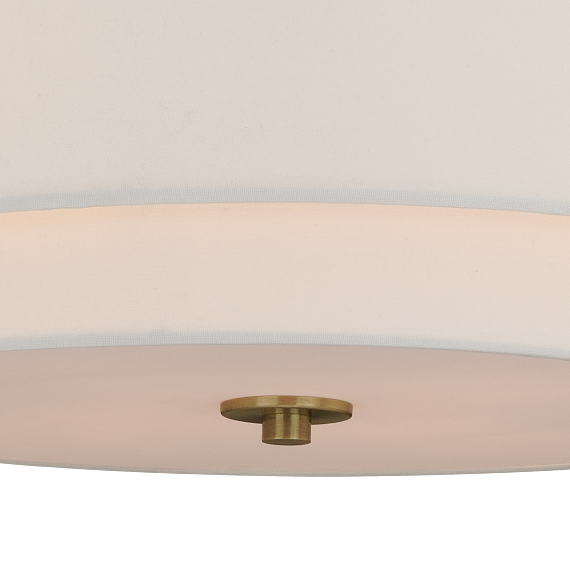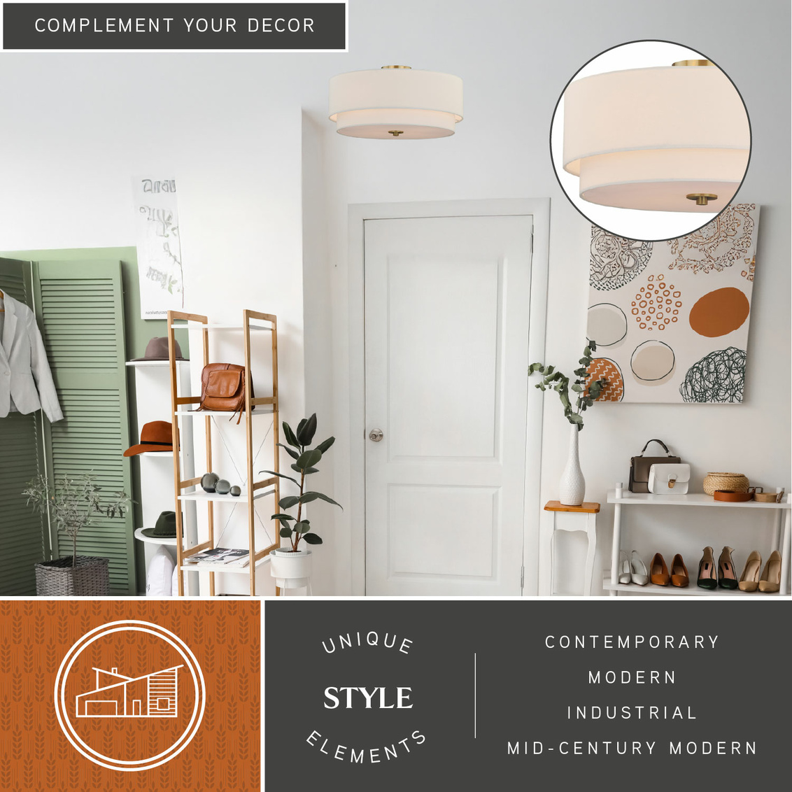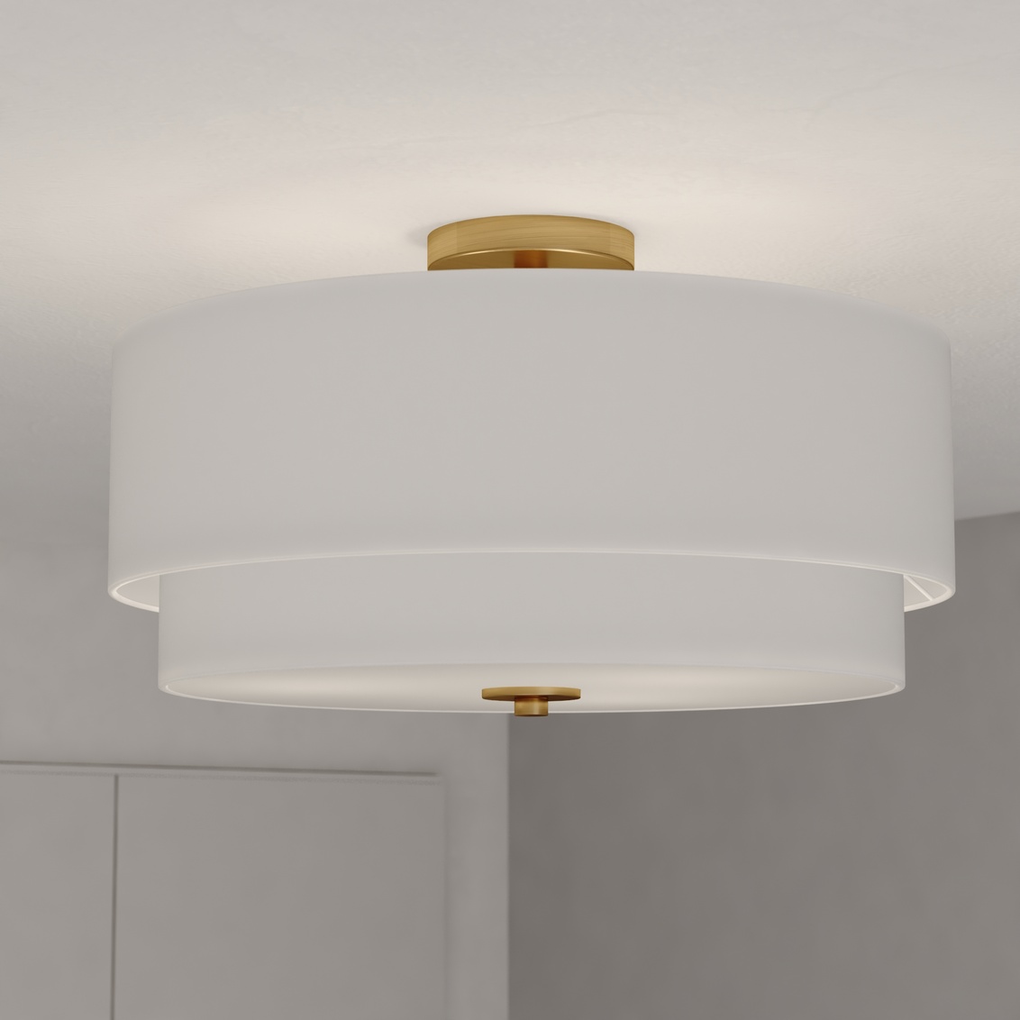 Indulge your mid-century modern dreams with this timeless collection. The Burnaby collection brings an undeniably contemporary feel to your modern interiors with its interplay of linen and brass. This semi-flush mount ceiling light is perfect for a low ceiling foyer, living room, hallway, entryway, or bedroom. Its soft mid-century modern style is enhanced by a white linen drum shade. An acrylic diffuser hides the bulbs and creates even light distribution.