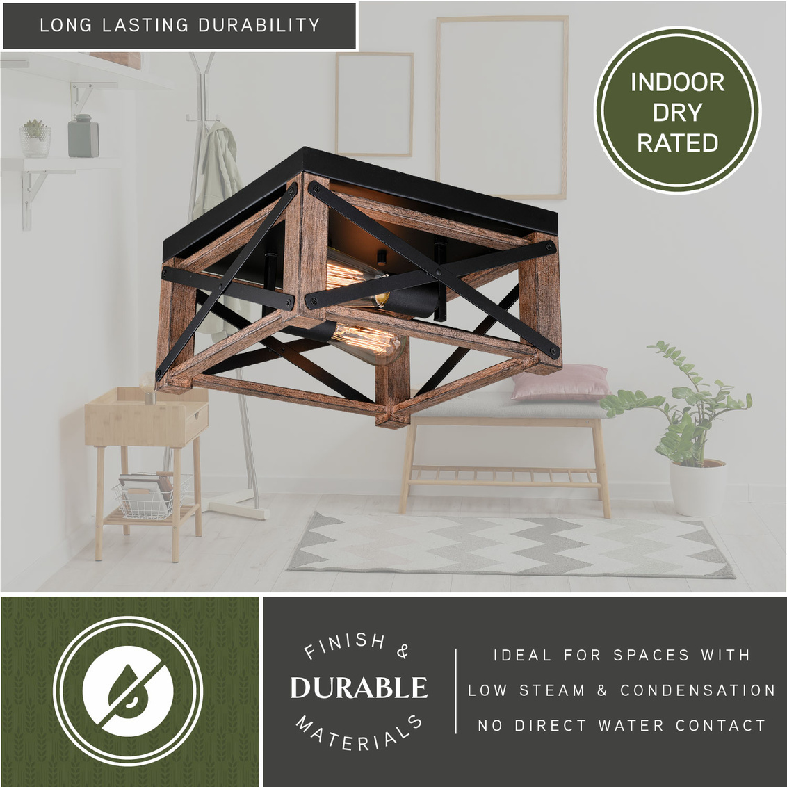 The Colton is a handsome rustic collection inspired by the expansive stretches of fencing often seen on the ranch. Ceiling and wall mounted fixtures make a strong statement with their crisscross dark bronze accents. Industrial open cage framework is finished in a rustic oak which closely resembles natural wood grain. Combine that with vintage Edison style filament bulbs to complete the look. This living collection can be enjoyed wherever you would like a bit of flair, whether over your dining table, in your family room or hallway.
