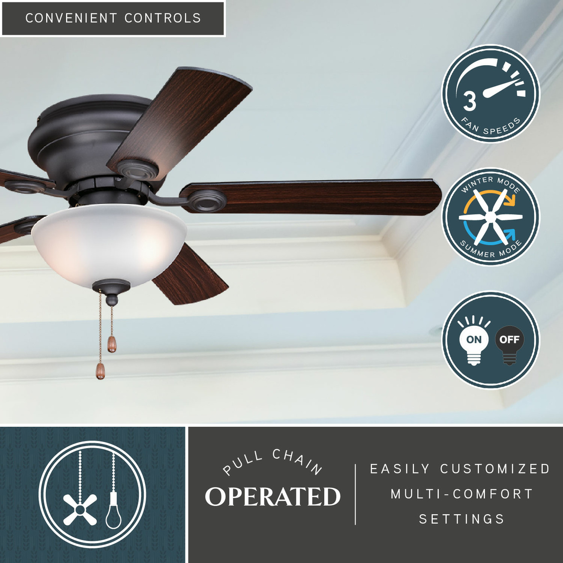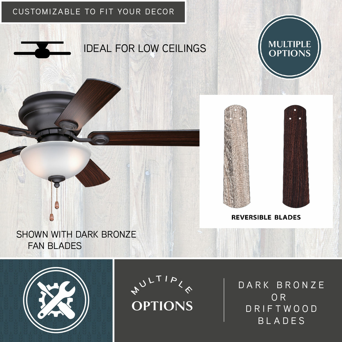 The Expo 42 inch ceiling fan is an elegant close-to-ceiling fan that is perfect for living rooms, bedrooms , and other rooms that may have a low ceiling. The Expo features a noble bronze finish with a 153 x 10 mm motor with a 12 degree blade pitch. With a transitional silhouette, the Expo ceiling fan features 5 reversible dark bronze or driftwood MDF blades and elegantly simple housing. The Expo has a 42-inch blade sweep and a 5-blade design that delivers a distinct profile. The included LED bowl light kit offers bright illumination. Can be alternatively installed without the light kit.