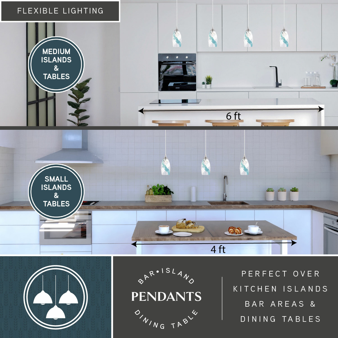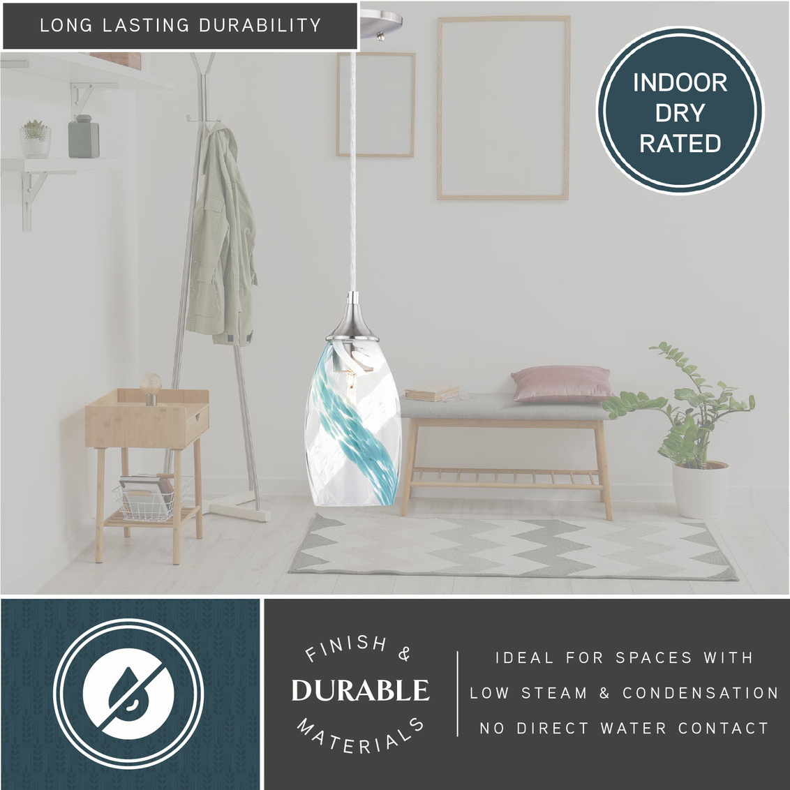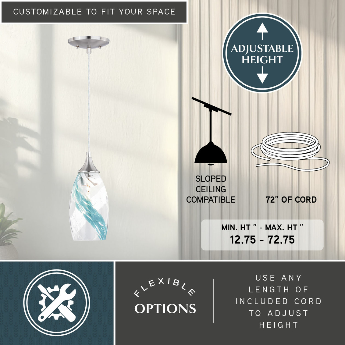 Beauty and pizzazz come together in this stunning addition to the Milano art glass collection. Artfully designed with blue and white painterly swirl, this ceiling mount pendant light features a satin nickel finish. Combine that with a vintage Edison style filament bulb to complete the look. Install this mini pendant individually or in a group; ideal for kitchens, dining areas, or bar areas.