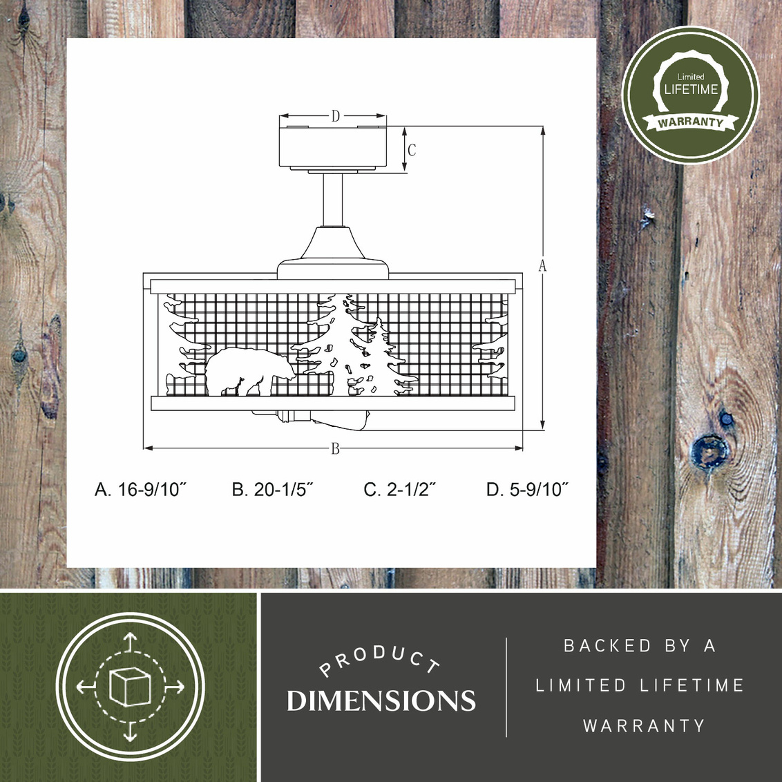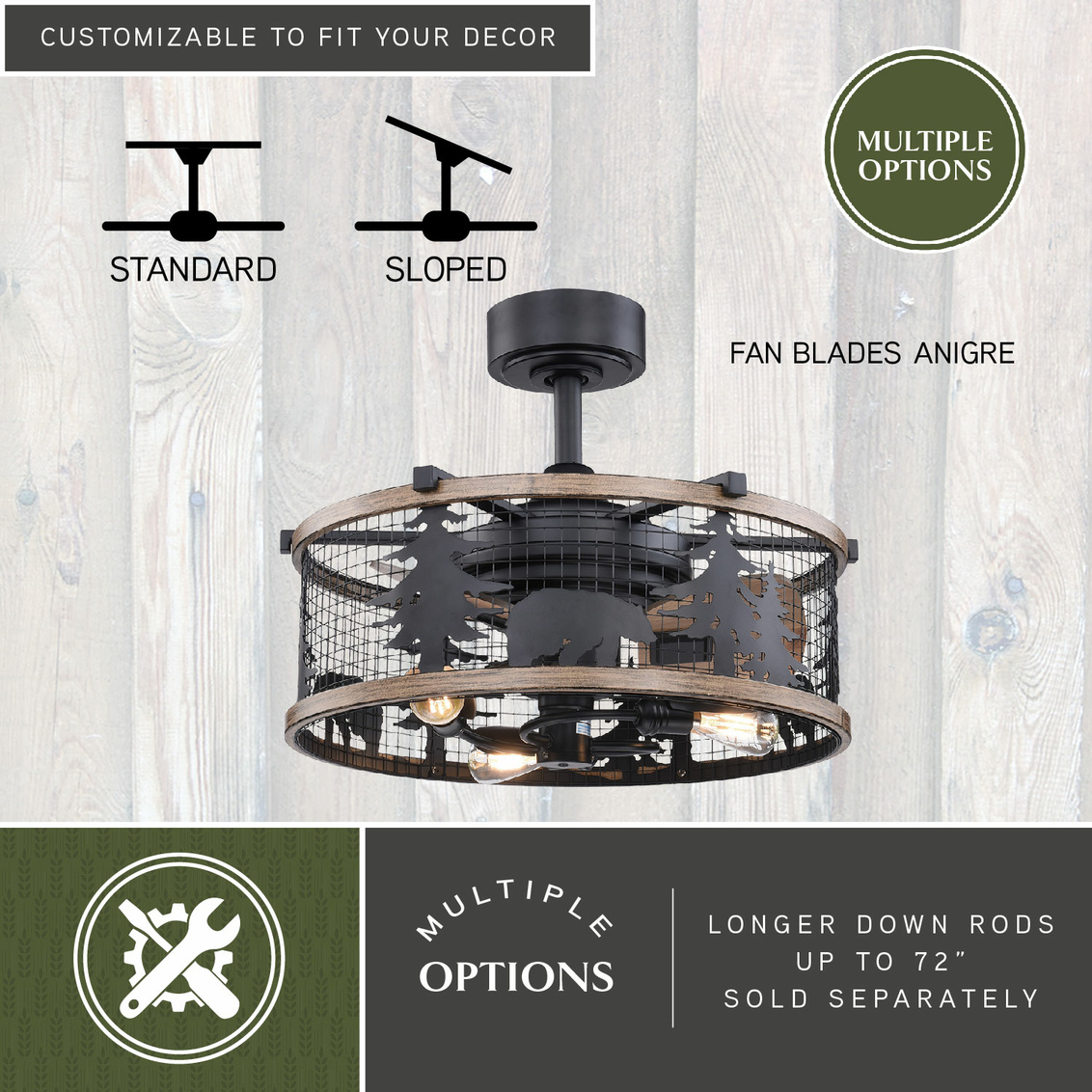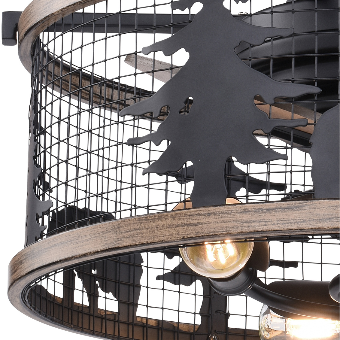 Get wild with this indoor-outdoor drum style fan called Kodiak. The pairing of the black and burnished teak finishes enhance the on-trend metal cage perfectly. Capture your love of nature with pine tree and bear silhouettes. It is a great choice for a vacation lodge, cabin or suburban home and will complement a variety of home styles: anywhere you want to bring an element of nature. An LED light source provides energy saving, low maintenance and long-lasting performance. Combine that with vintage Edison style filament bulbs to complete the look. Rated for damp locations, ideal for your covered porch, family room, or any other area of your home.