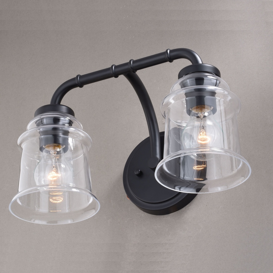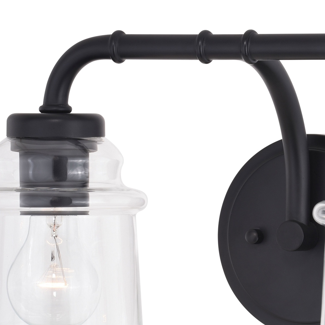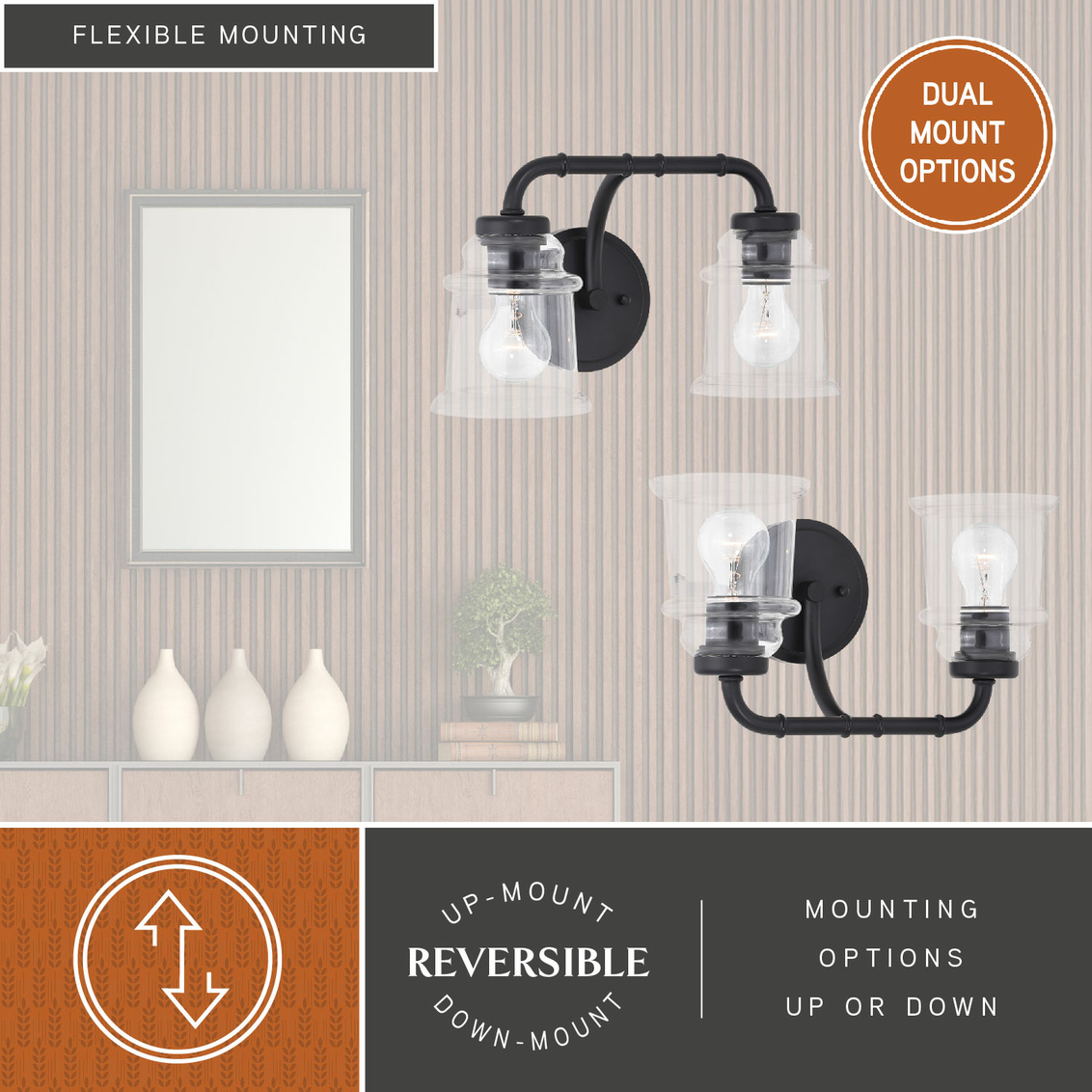 Clean retro lines define this beautiful collection called Toledo. Notes of industrial and farmhouse tradition are defined with the elegance of clear blown glass. Combine that with a vintage Edison style filament bulb to complete the look. Versatile reversible mounting option lets you install this fixture up or down. This bathroom light is perfect over small vanities or as a pair over double sinks.