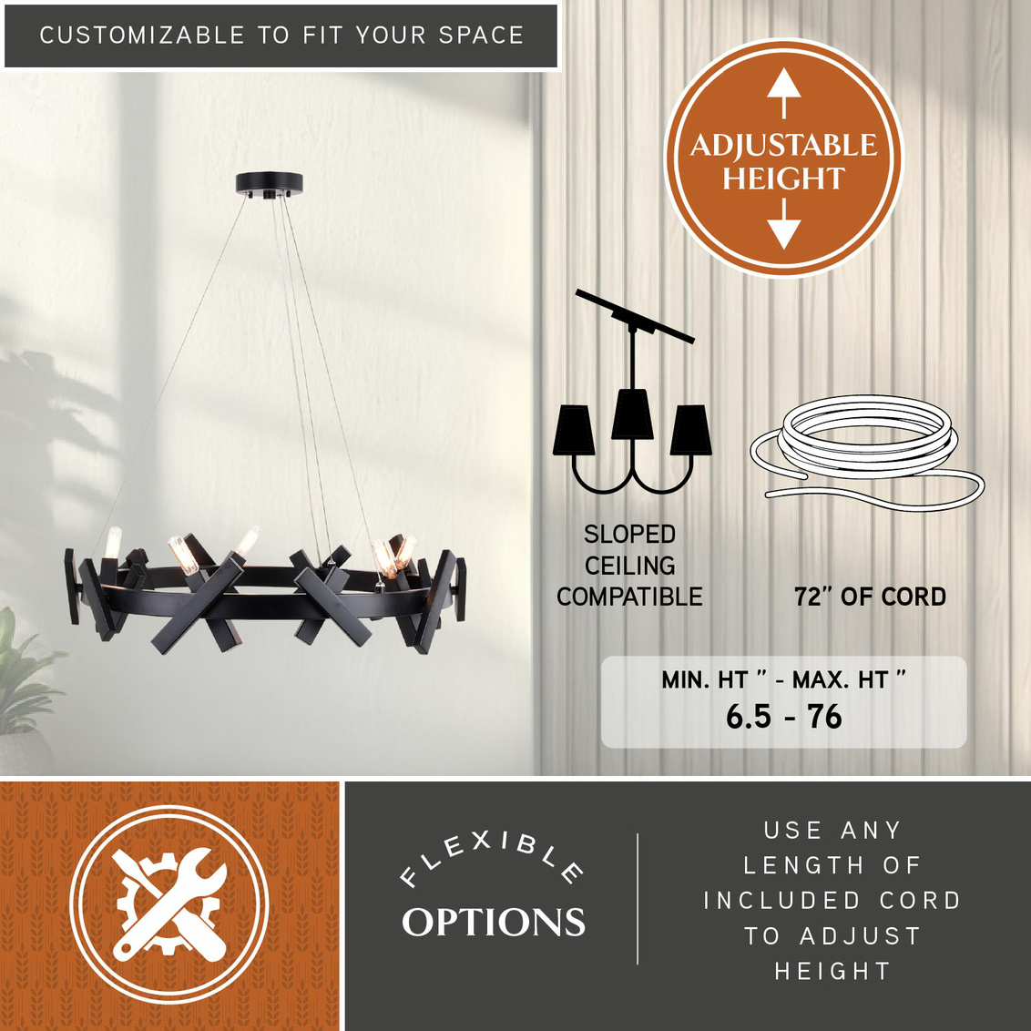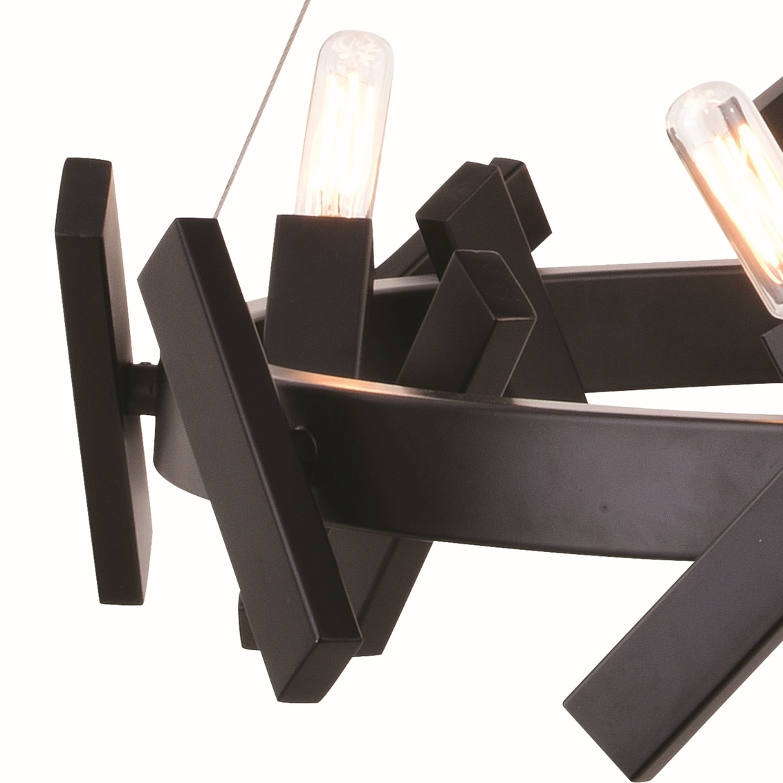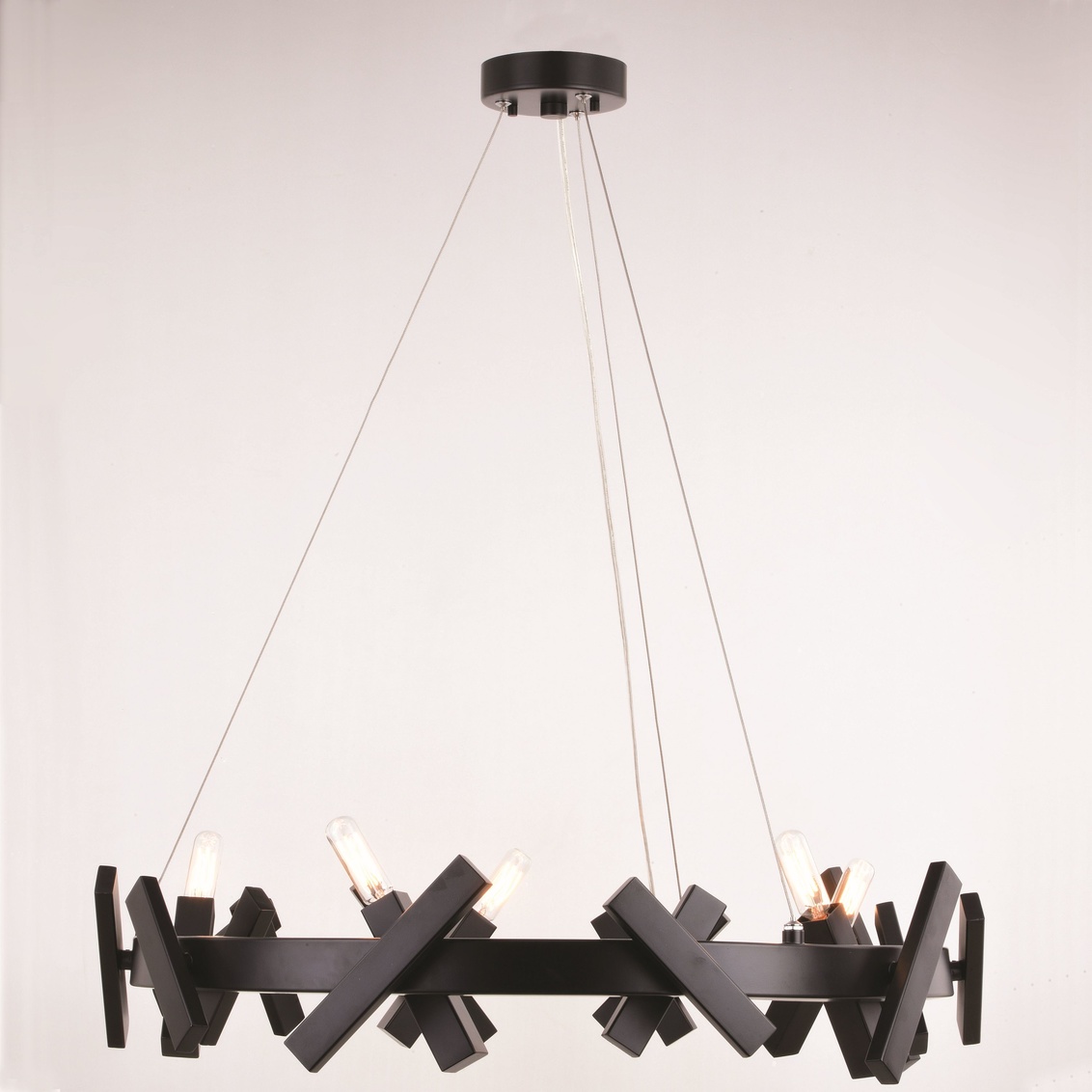 The Wells collection is a playful accent to any contemporary or industrial space. The X pattern dances around a circular wagon wheel frame. Discreet cables suspend the fixture from a ceiling mounted metal canopy. A strong matte black finish completes this look. Wells is the perfect addition to any dining, living space or entryway.