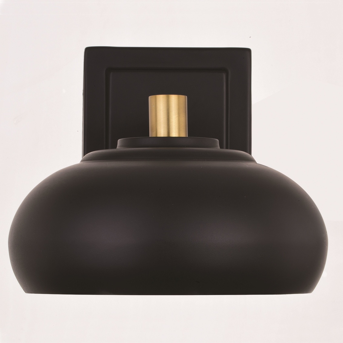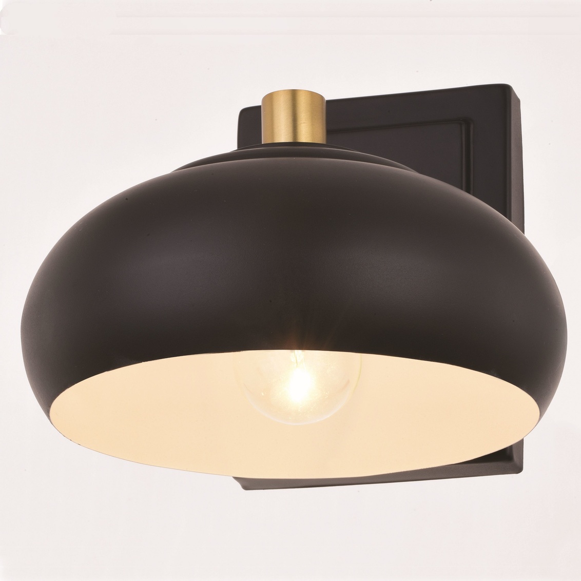 Understated elegance describes the contemporary Belmont collection. A dome shaped metal shade hangs in perfect symmetry along a satin brass metal support. The white interior of the matte black shade casts a soft glow for the ideal look. This wall sconce light brings a mid century modern flair to any bath, bedroom or living space.