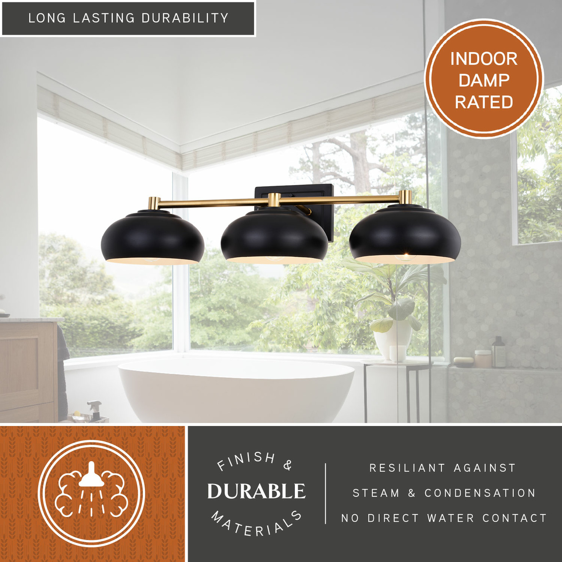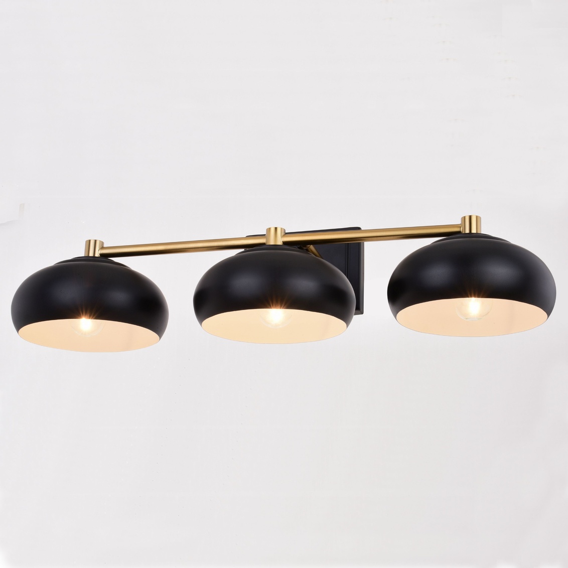 Understated elegance describes the contemporary Belmont collection. A repetition of dome shaped metal shades hang in perfect symmetry along a satin brass metal support. The white interior of the matte black shade casts a soft glow for the ideal look. This vanity wall light brings a mid century modern flair to any bath, bedroom or living space.