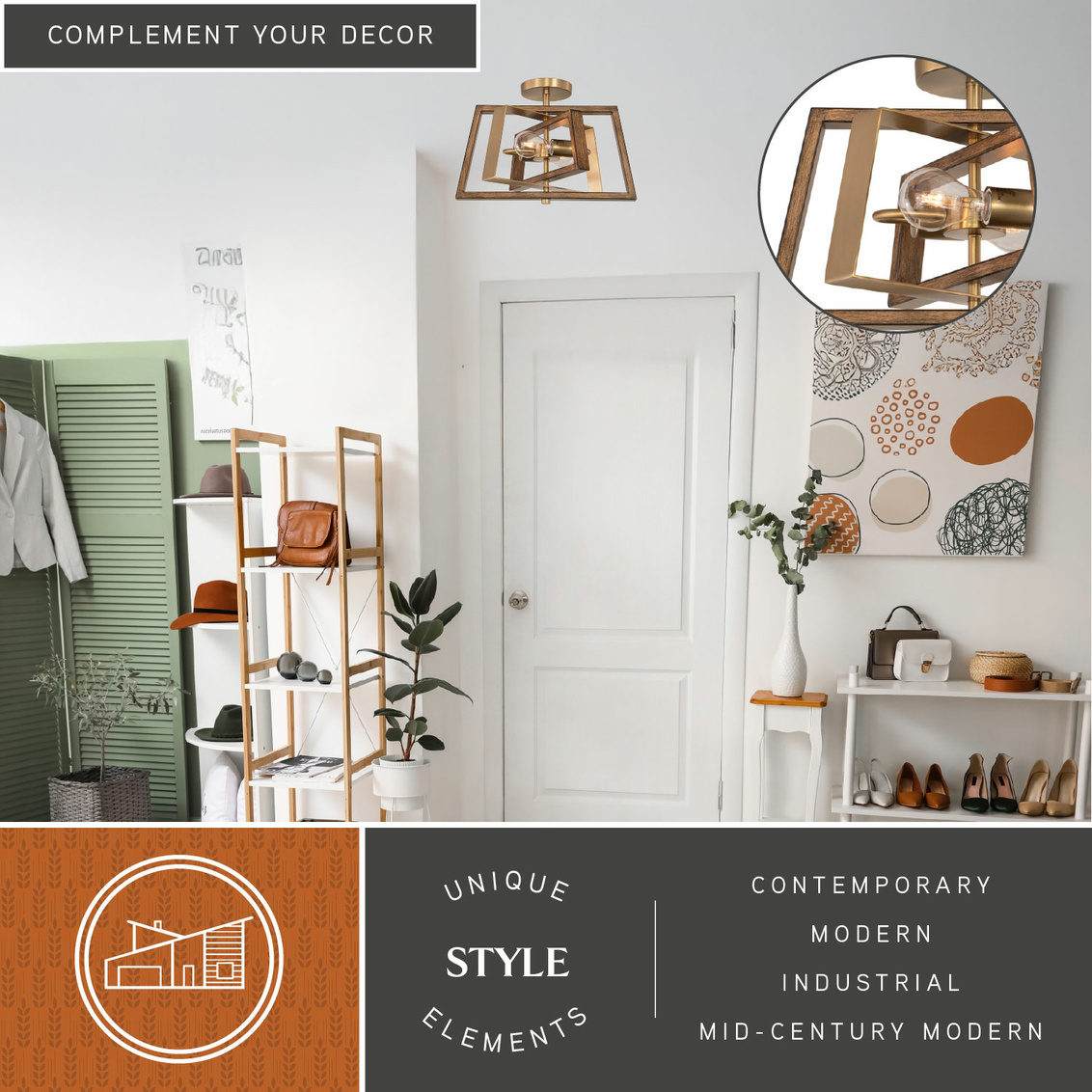 Keyword:120 Volts Bedroom Box Brass Brown Bulb Burnished Ceiling Chestnut Contemporary Dimmable Dining Room Down Dry Edison Filament Entrance Entryway Family Fixture Flush Mount Foyer Geometric Gold Hallway Hanging Hardwired Indoor Interior LED Compatible Lighting Living MCM Medium Metal Mid-Century Modern Office Open Bottom Rectangle Semi Square Steel Table Title 20 Transitional Up Wood
