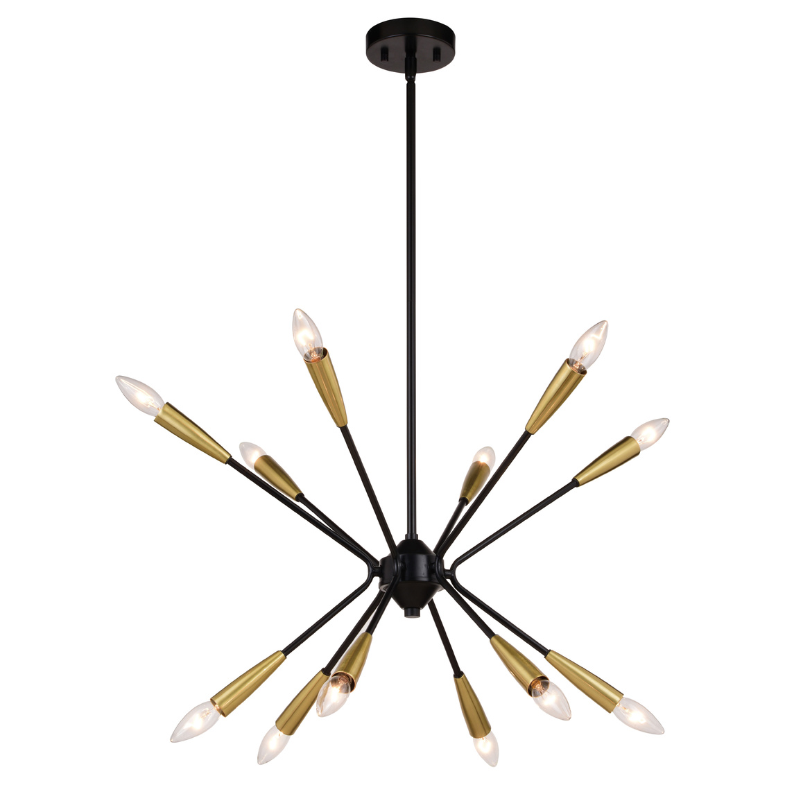 This is the exciting new Ellis collection. Arms bursting outward in all directions create a mid-century modern flair that will surely get people talking! Sleek matte black and satin brass finishes outline the strength of this stunning collection. Add this 12-light pendant to any entryway, bedroom, living area or dining room for a mid-century modern update.