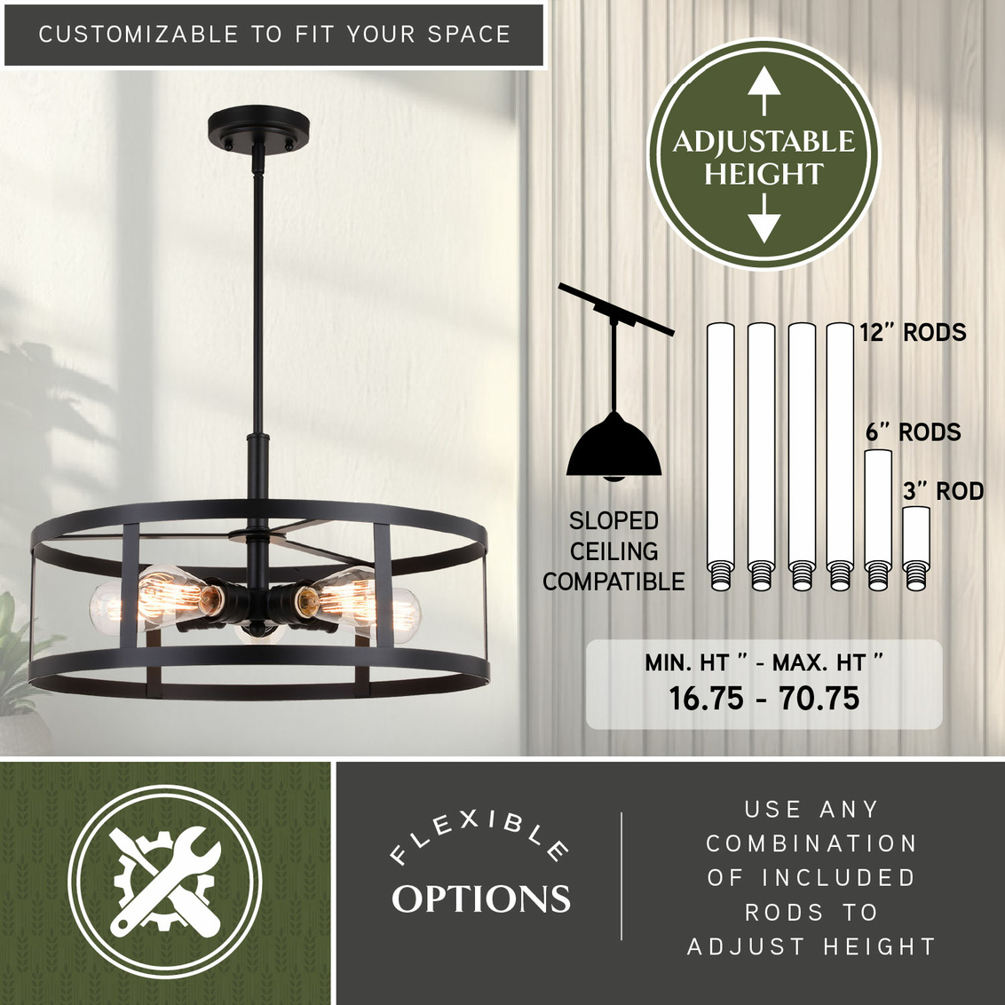 Keyword:Adjustable Angled Ceiling Bronze Brown Bulb Cage Chandelier Dimmable Dining Room Down Rod Downrod Drum Entrance Entryway Family Farmhouse Fixture Foyer Front Door Hanging Industrial Kitchen LED Compatible Lighting Living Metal Shade Mini Mount Oil Rubbed Pendant Round Sloped Table Vaulted