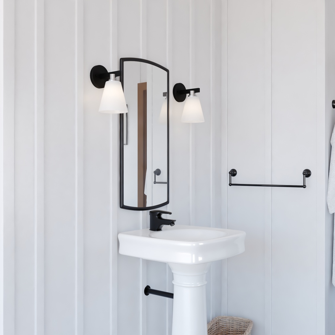 Elegance is exemplified in this collection called Vermont. A simple line of matte black metal acts as a striking backdrop to the etched white glass shade. This generously sized shape is met with a hint of satin nickel for just the right amount of sheen. Add this understated, but beautiful example of elegance to any trendy hallway, bedroom, or bath.