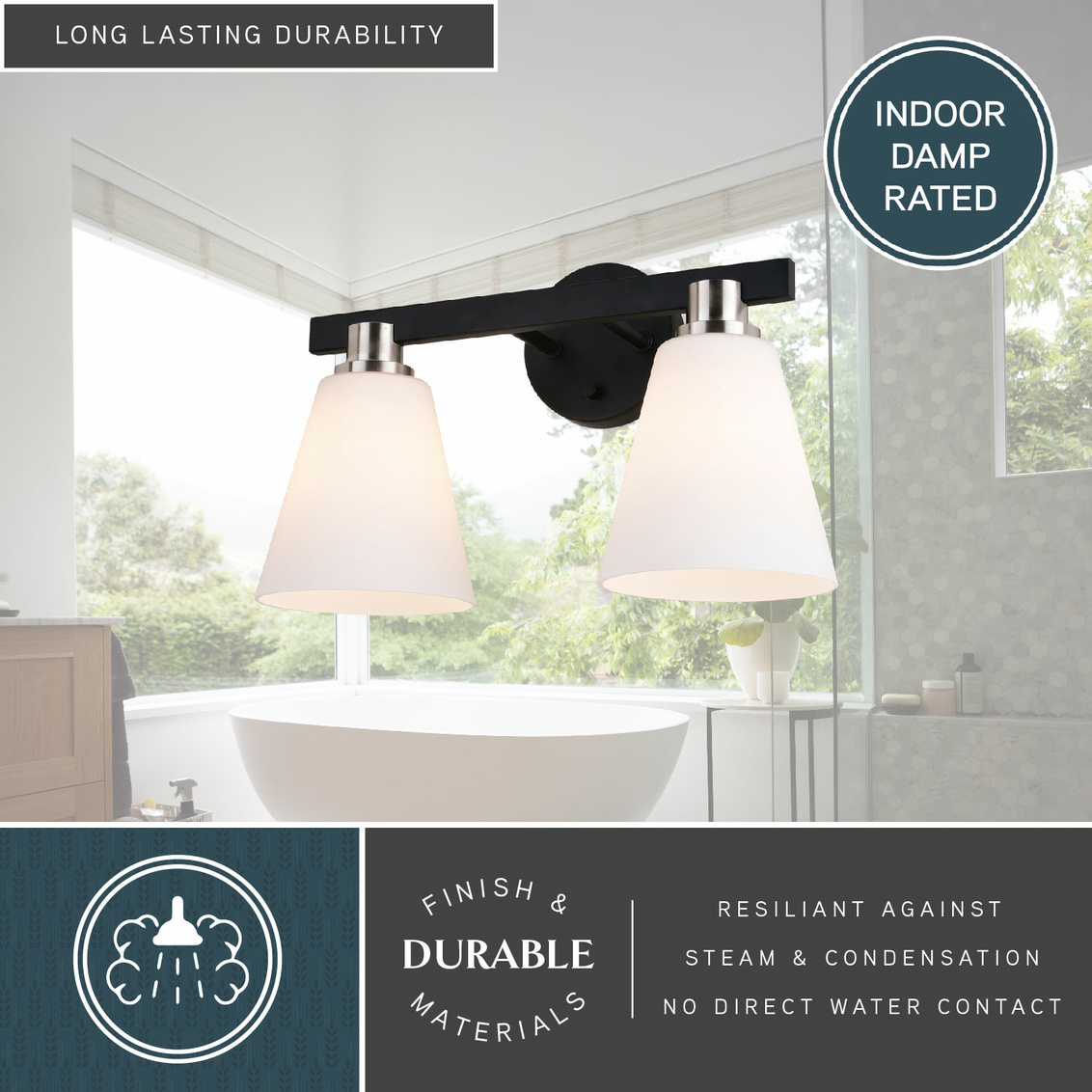 Elegance is exemplified in this collection called Vermont. A simple line of matte black metal acts as a striking backdrop to the etched white glass shades. These generously sized shapes are met with a hint of satin nickel for just the right amount of sheen. Add this understated, but beautiful example of elegance to any trendy bath or other areas of your home.