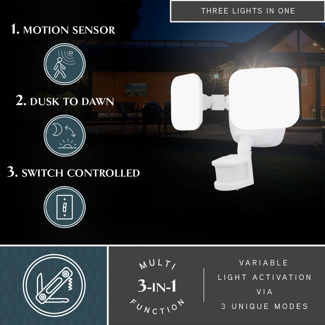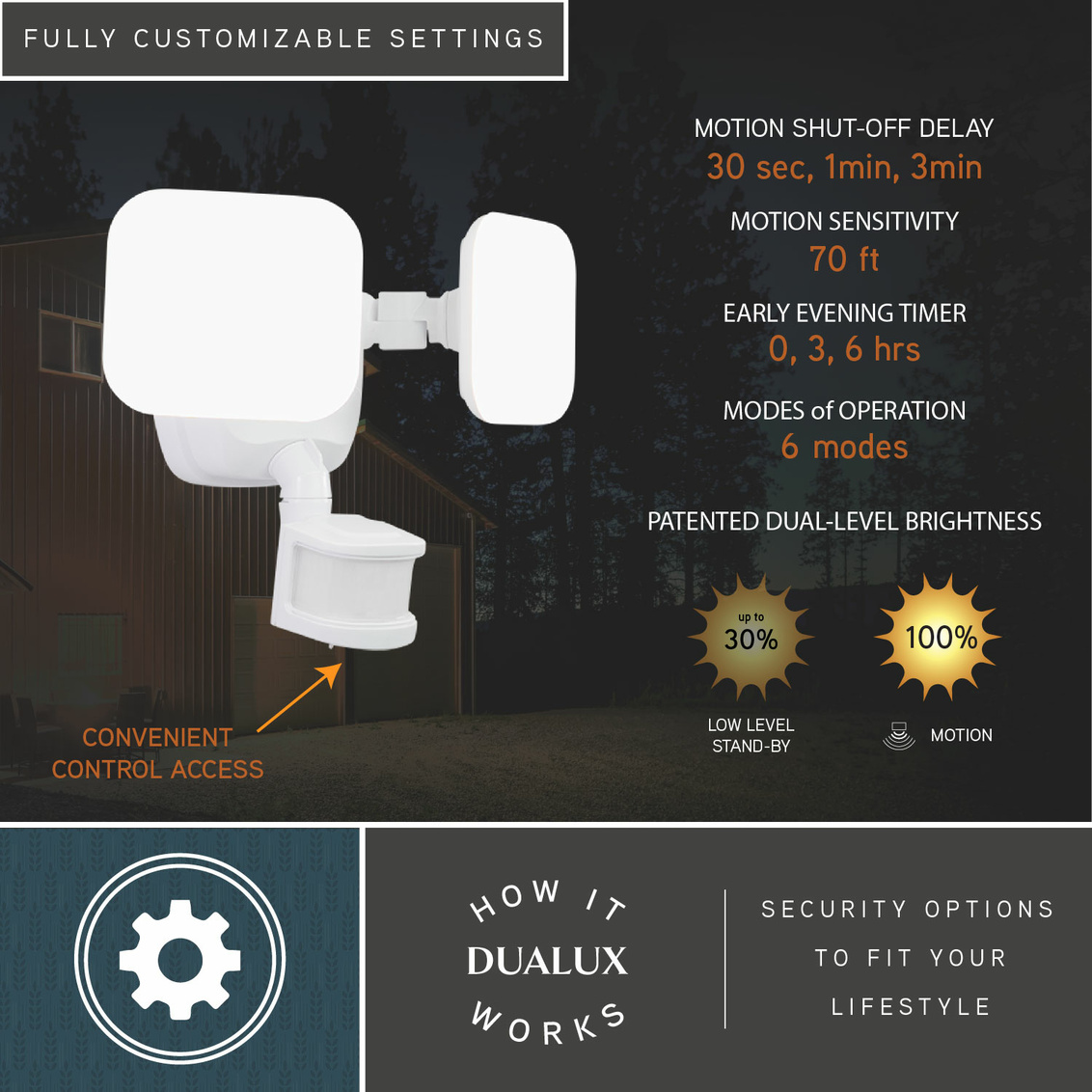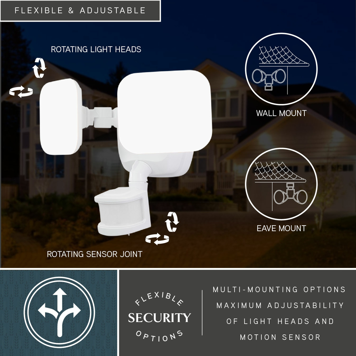 The white Theta 2-light LED outdoor motion sensor flood light provides low level 2700K ambient lighting throughout the night and bright 5000K high level when motion is detected. The modern light heads are fully adjustable and deliver 2200 lumens to keep your home's exterior brighter at dusk, dimmer at night, and instantly bright when motion is detected. This dualux security light expands the functionality, safety, and security of your home's outdoor spaces with bright, reliable light when and where it is needed.