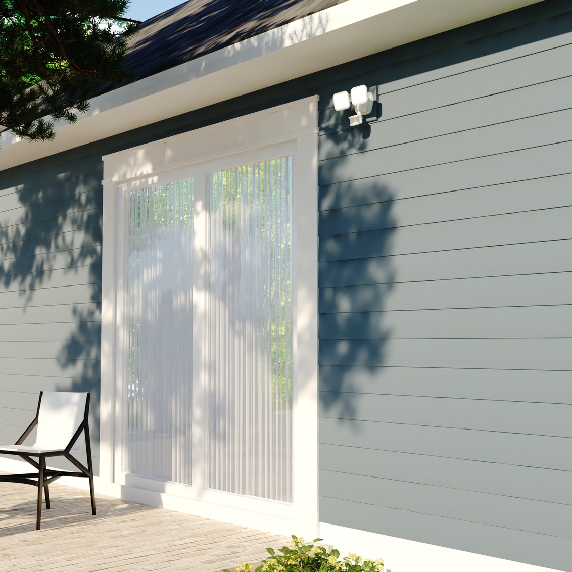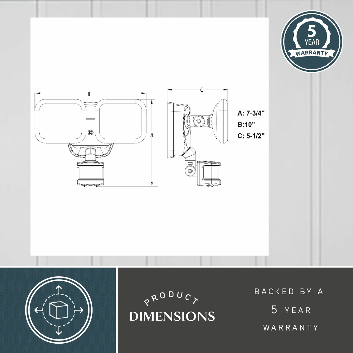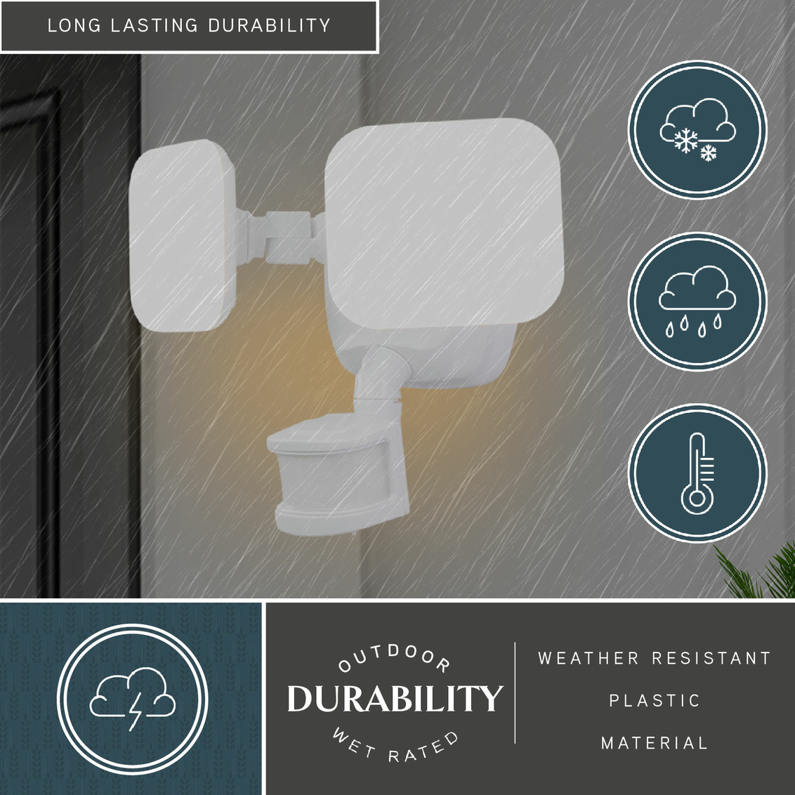 The white Theta 2-light LED outdoor motion sensor flood light provides low level 2700K ambient lighting throughout the night and bright 5000K high level when motion is detected. The modern light heads are fully adjustable and deliver 2200 lumens to keep your home's exterior brighter at dusk, dimmer at night, and instantly bright when motion is detected. This dualux security light expands the functionality, safety, and security of your home's outdoor spaces with bright, reliable light when and where it is needed.