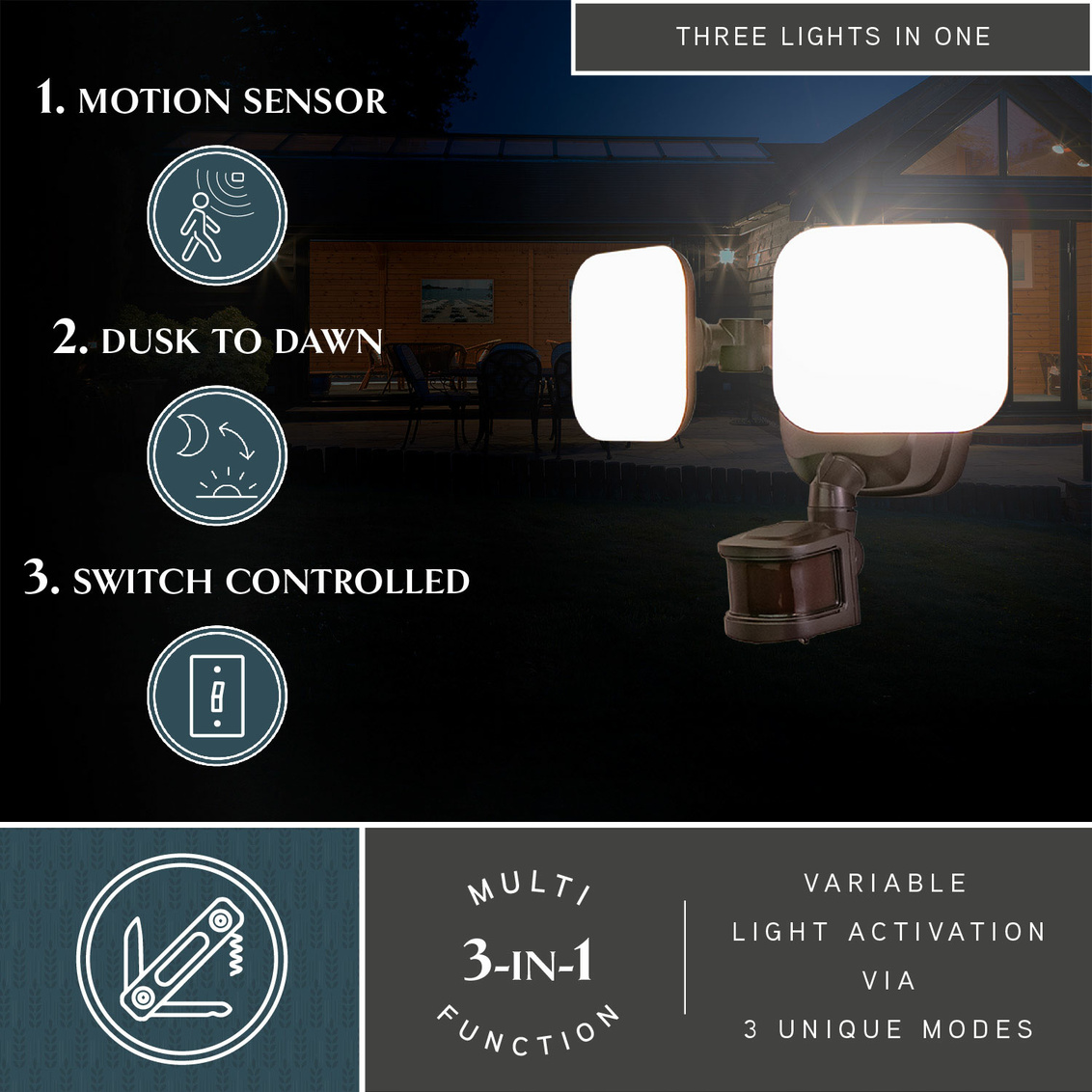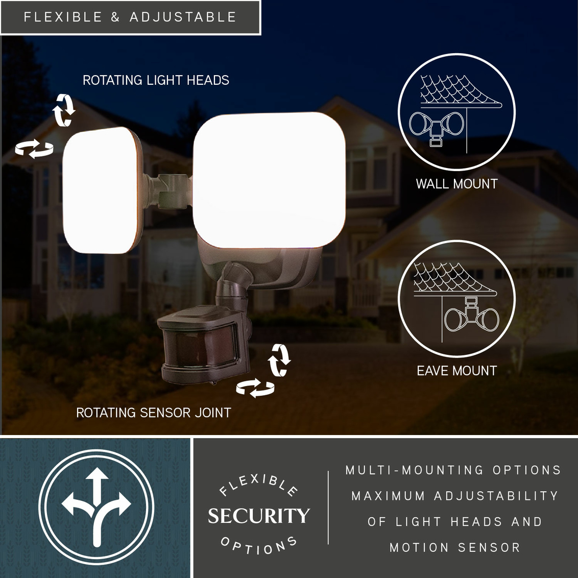 The bronze Theta 2-light LED outdoor motion sensor flood light provides low level 2700K ambient lighting throughout the night and bright 5000K high level when motion is detected. The modern light heads are fully adjustable and deliver 2200 lumens to keep your home's exterior brighter at dusk, dimmer at night, and instantly bright when motion is detected. This dualux security light expands the functionality, safety, and security of your home's outdoor spaces with bright, reliable light when and where it is needed.