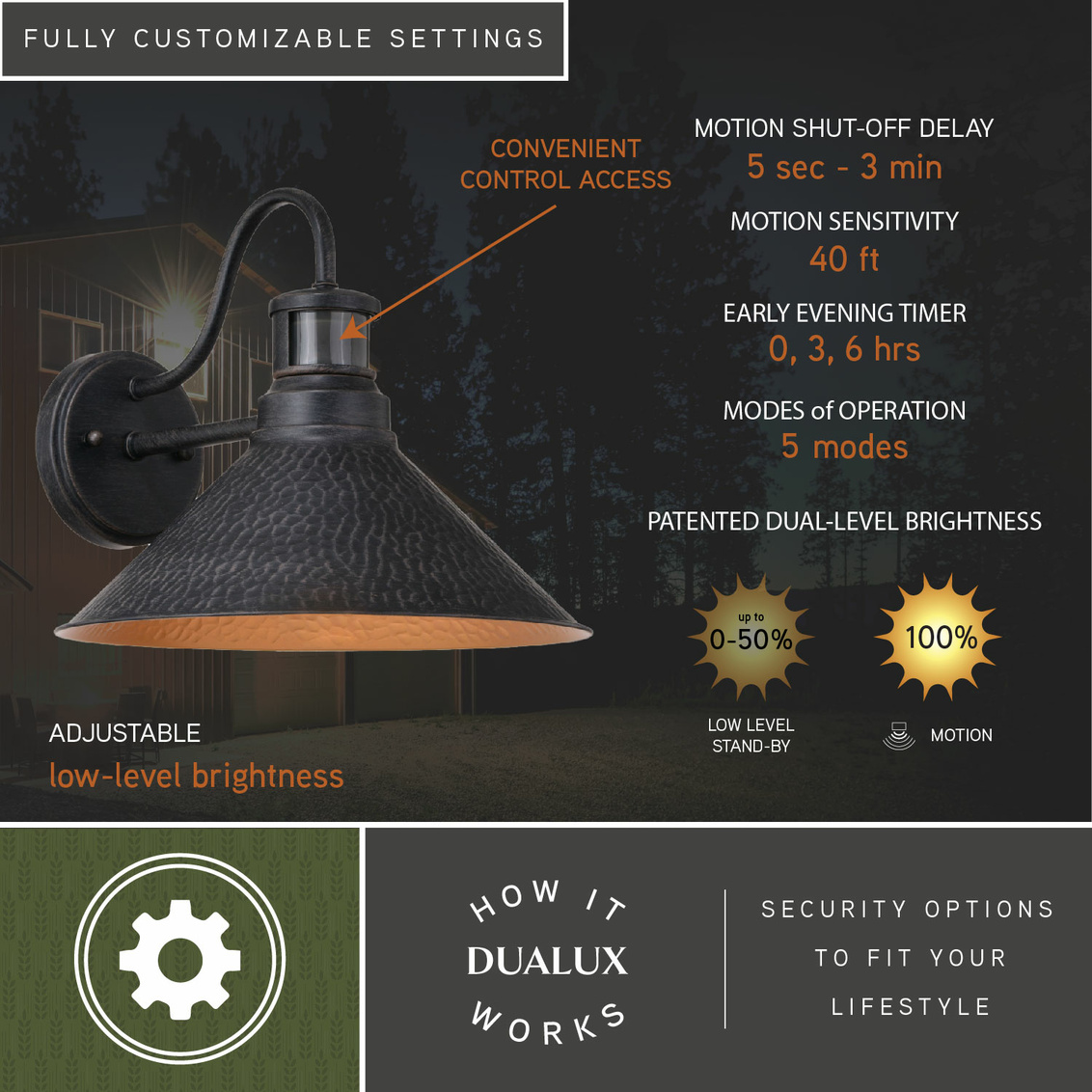 Designed with stately, yet rustic sophistication, the Outland collection is a solid choice for your outdoor space. The finish gives this barn light a warm and inviting elegance, and the finish inside the shade adds to the charm. This outdoor wall light is ideal for your covered porch, entryway, garage, or any other area of your home. Dualux patented dual-level security lighting is outdoor lighting made smarter - brighter light at dusk, dimmer at night, brightening instantly when it detects motion. Designed to reliably and effortlessly enhance your home's beauty, security and efficiency from dusk to dawn with its built-in motion sensor and photocell. This fixture works with most dimmable LED bulb models. This decorative outdoor security light is designed to enhance the beauty, safety, and efficiency of your home.
