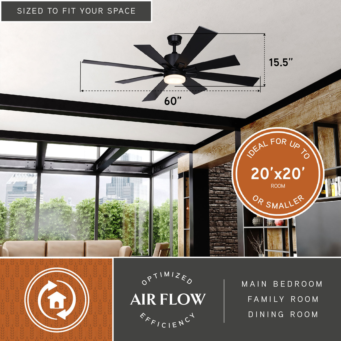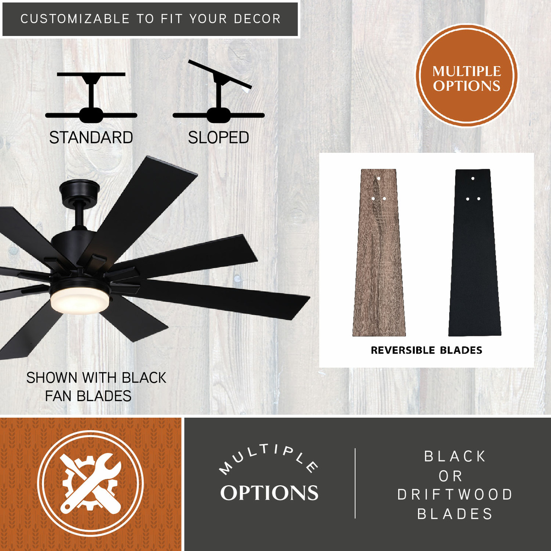 The Crawford takes its inspiration from the windmills seen throughout the countryside. This style blends with many decors including contemporary and modern farmhouse. It features dual length reversible black or driftwood blades with a trendy black motor housing. The Crawford fan features a DC motor that consumes less energy and is significantly quieter than conventional fans. An integrated LED light source provides energy saving, no bulb changing convenience, low maintenance and long-lasting performance. Rated for indoor and outdoor spaces, it is ideal for larger areas including great rooms, living rooms, and covered porches.