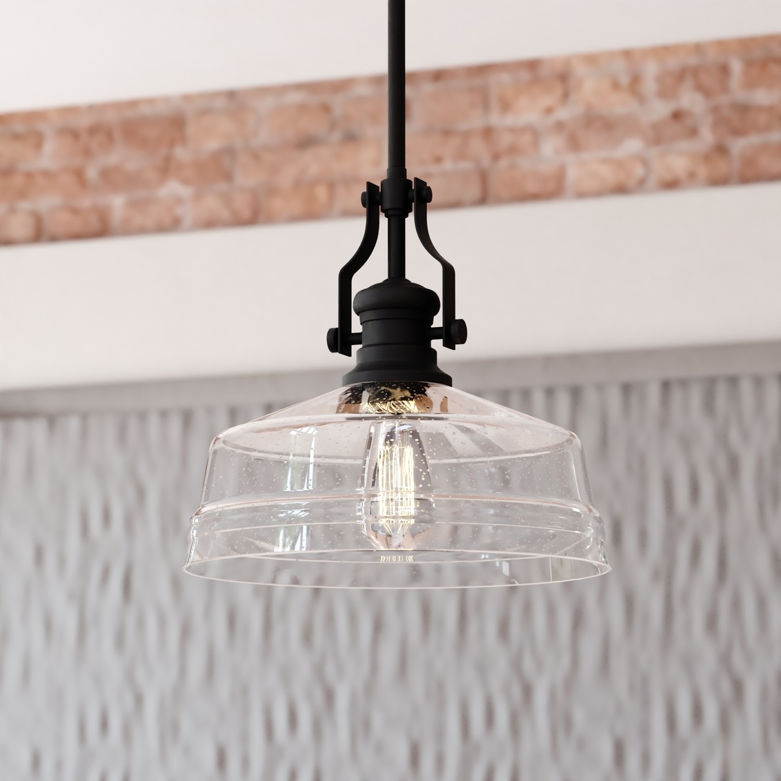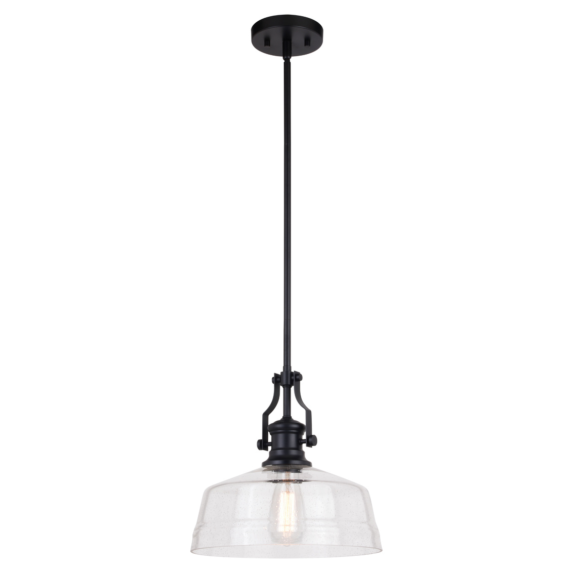 The Beloit pendant adds a welcoming and inviting feel to your kitchen or living spaces. Soft curving lines finished in matte black paired with a large clear seeded glass shade create a look that accents the most comfortable spaces. Combine that with a vintage Edison style filament bulb to complete the look. Bring a level of sophistication to your trendy farmhouse or urban style with this pendant.