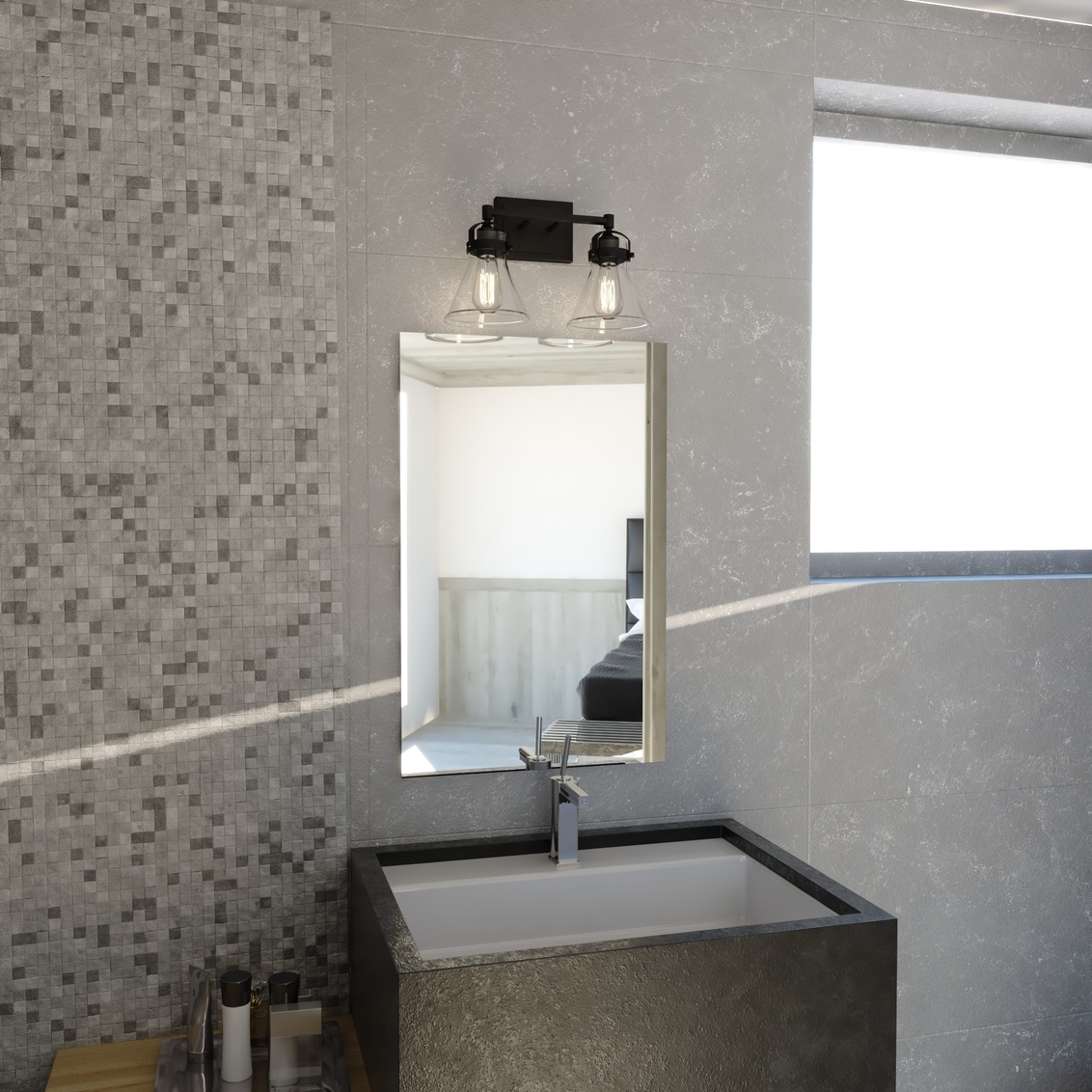 A nod to farmhouse and industrial aesthetics are realized in the Mason vanity collection. Charcoal black accents offer a striking contrast to each funnel shaped shade. As they sit perched along a horizontal support, a brilliant show of light pours from each shade, creating a bright shine on the subject below. This 2-light vanity is ideal in any bath, or interior space where extra light is welcomed.