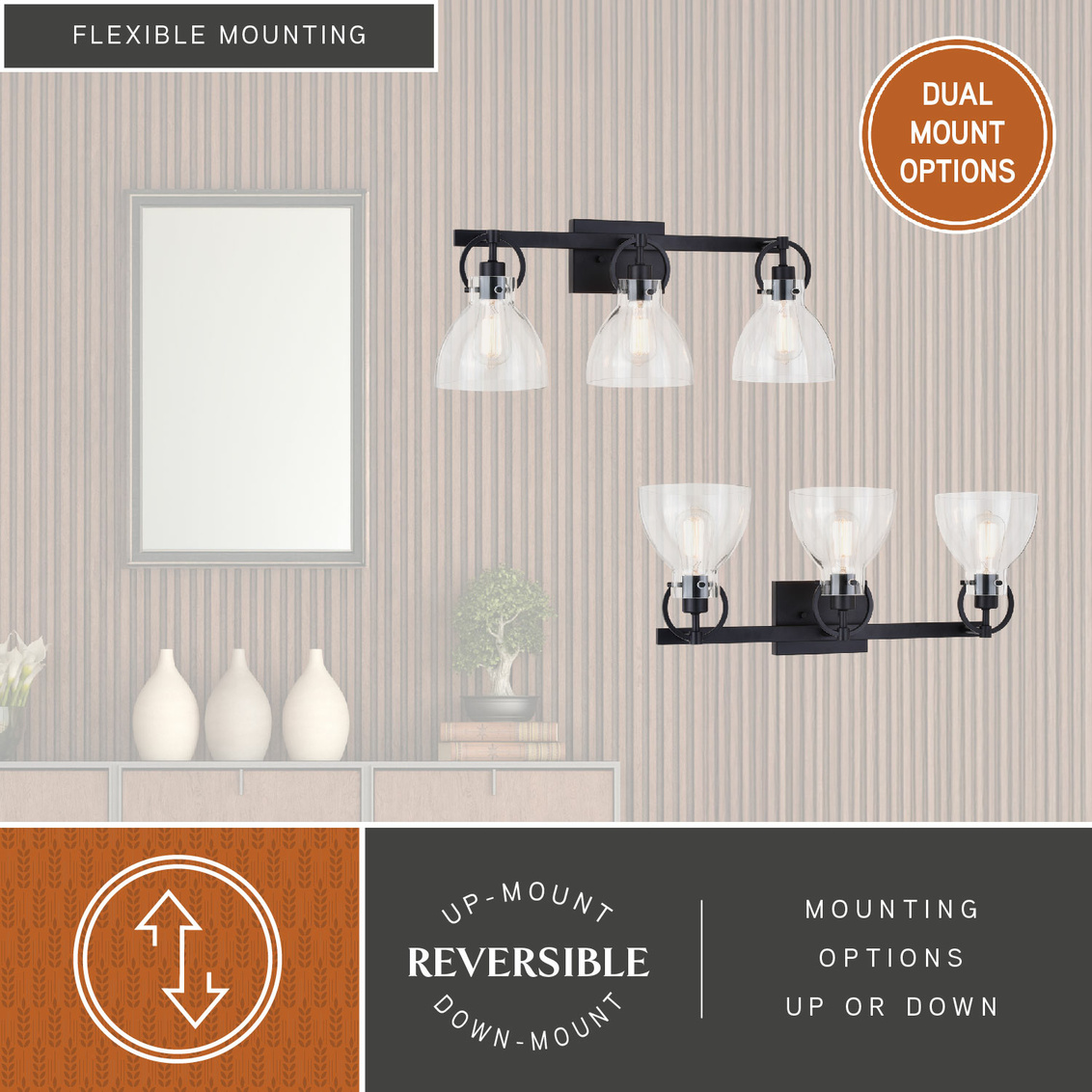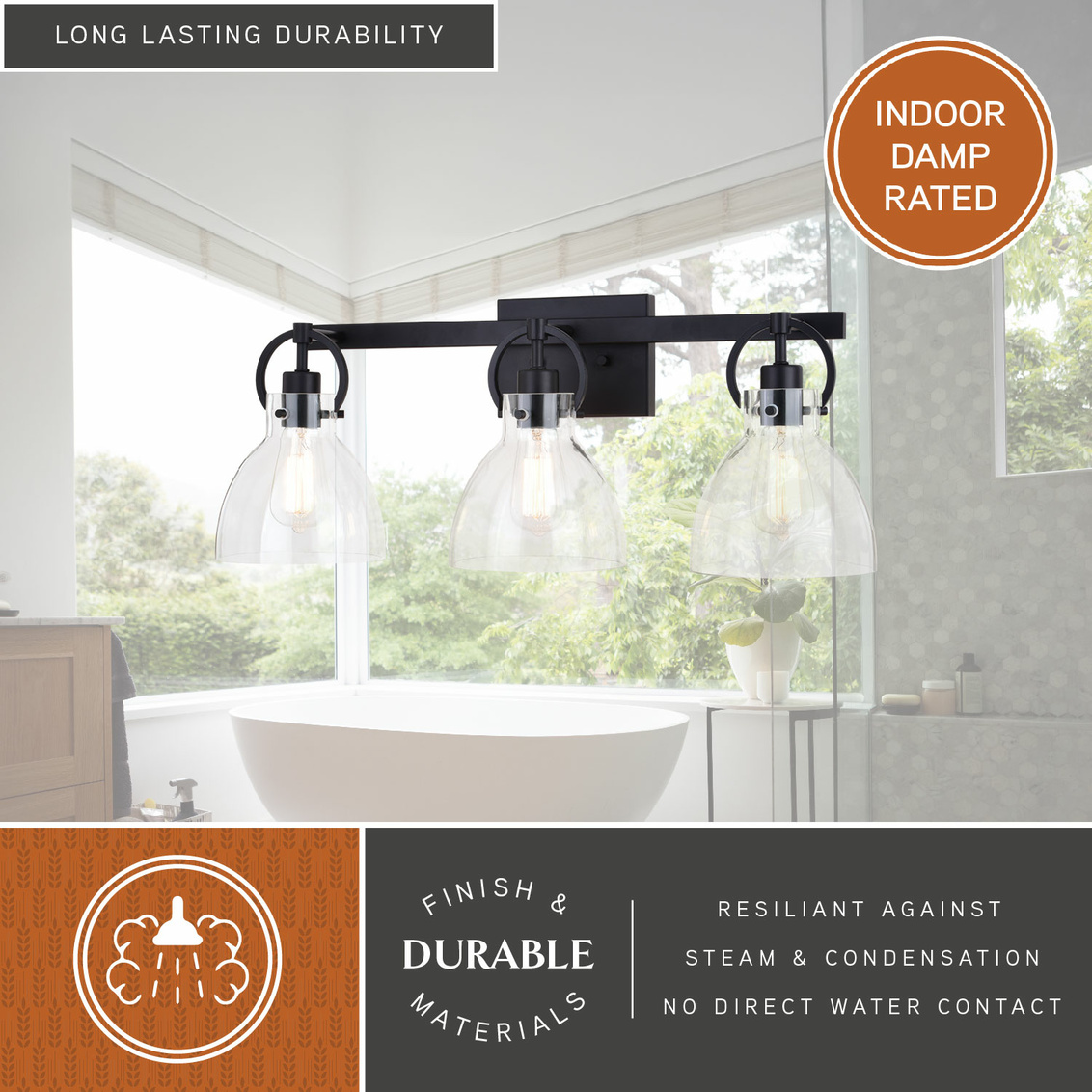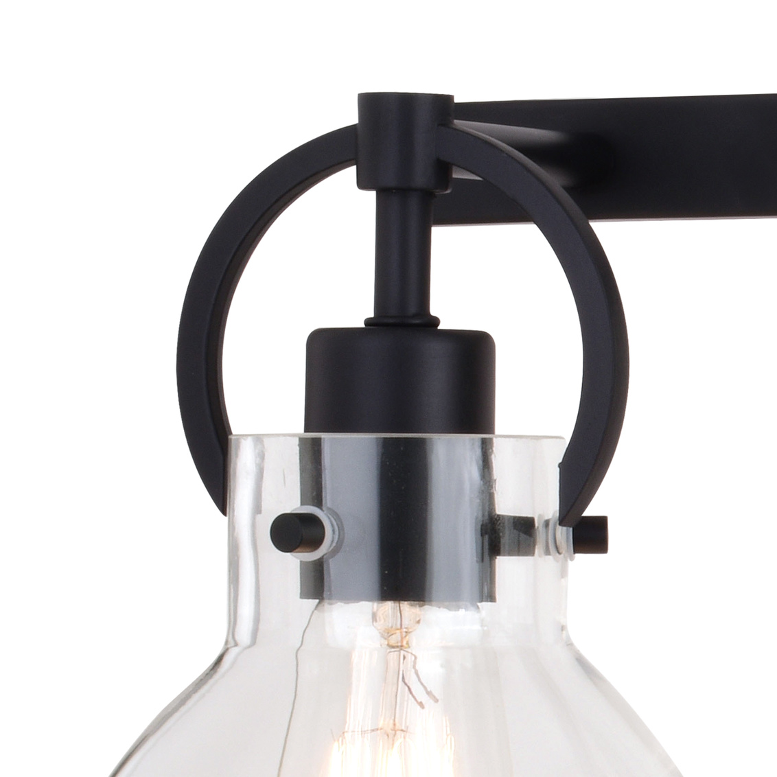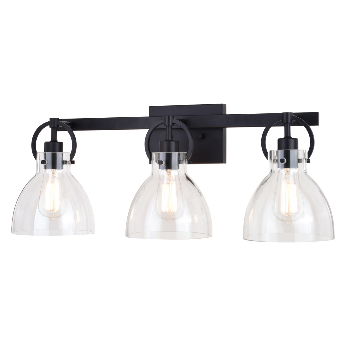 Clean and clear best depicts this contemporary collection called Ogden. Matte black hardware smartly adorns the clear glass shades. Small round handles casually hang from a horizontal support, while suspending the glass shades in perfect order. The large open styling allows each shade to emit the maximum light. This 3-light vanity is ideal in any bath or any other space where extra light is needed.