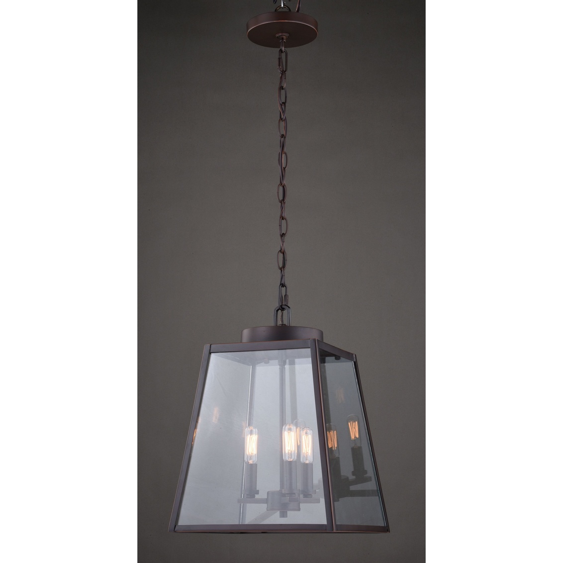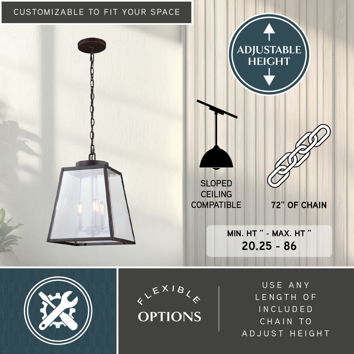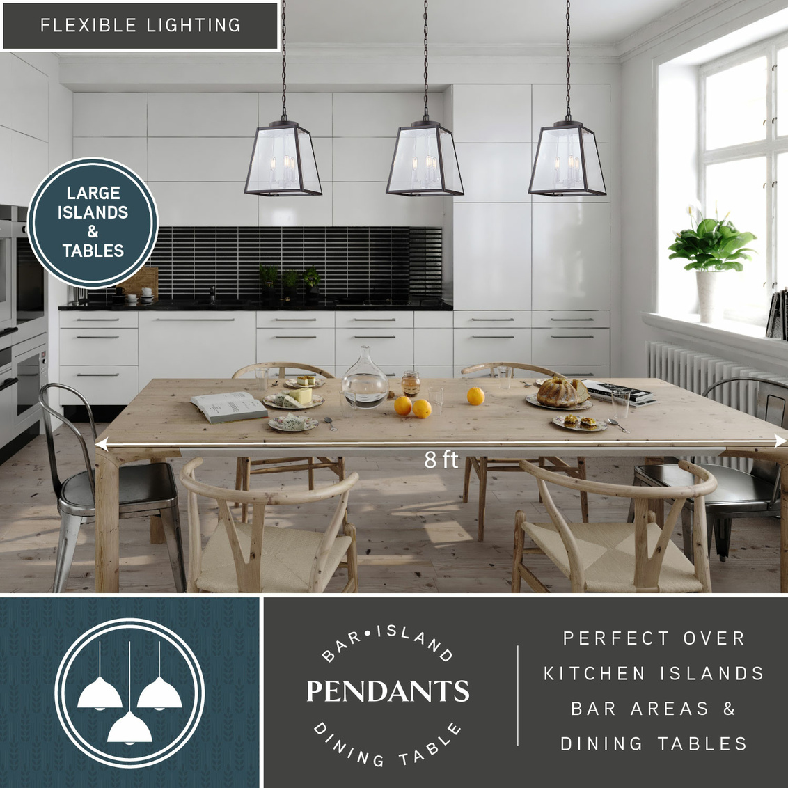 Contemporary simplicity and classical elegance are handsomely paired in the pendants named Grant. Large panes of glass are outlined in burnished bronze trim. Three candle-like bulbs delicately float within its classic geometric metal frame. The Grant is a stunning solution to any interior space. Combine that with a vintage Edison style filament bulb to complete the look.