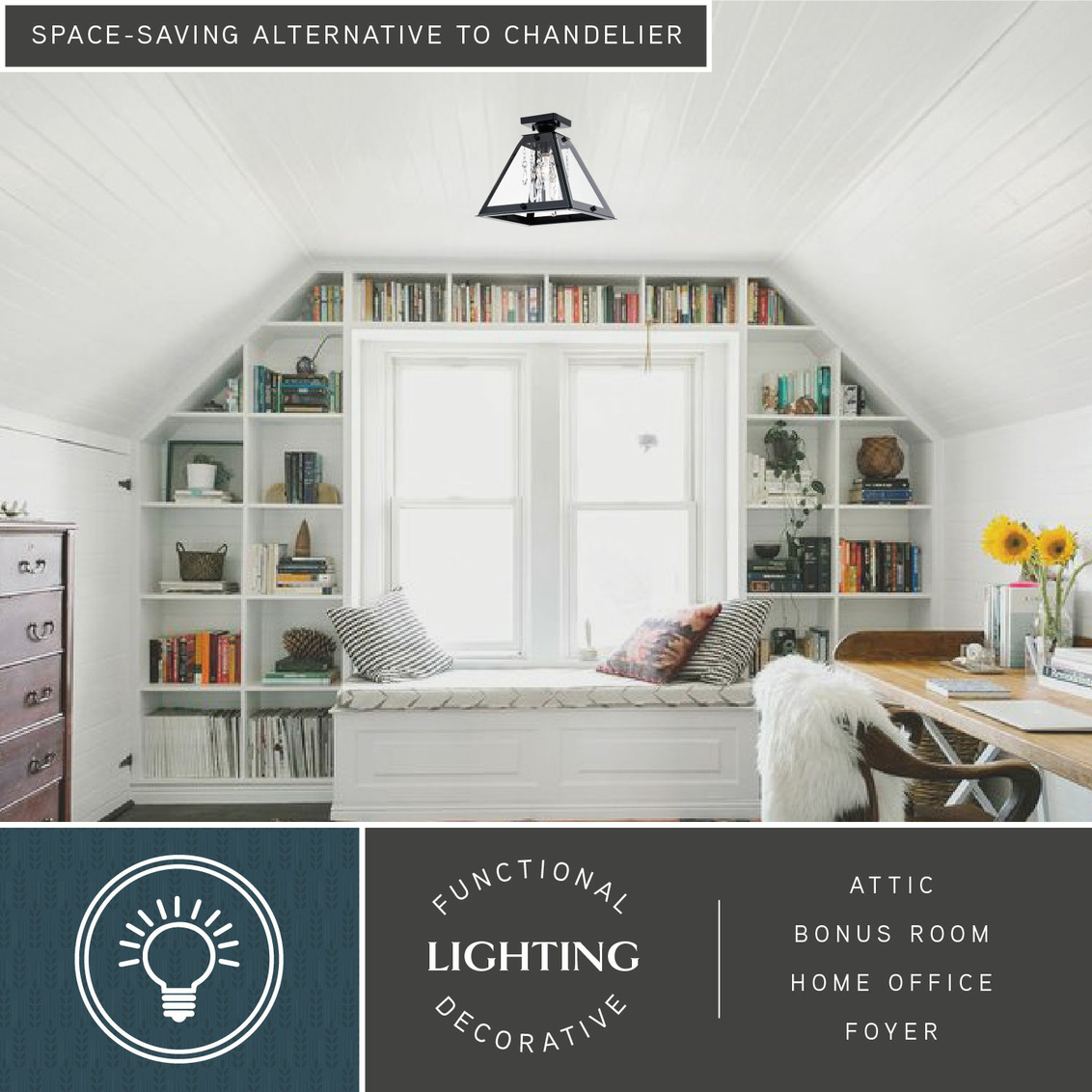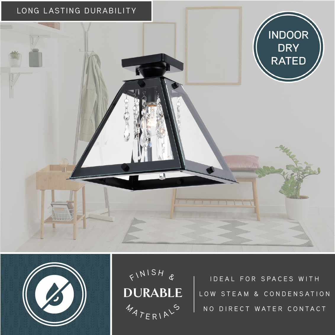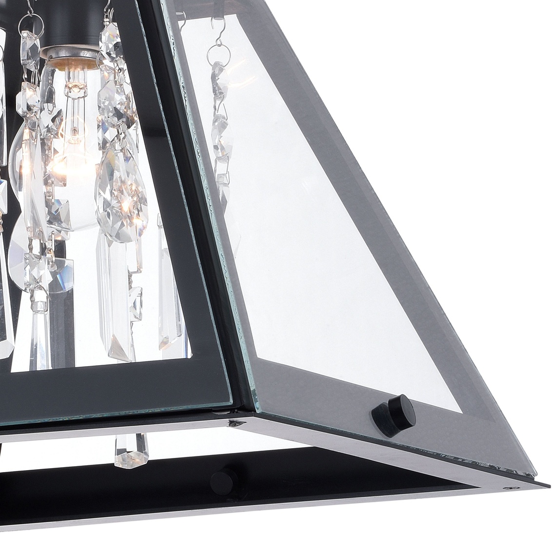 A touch of glam balanced with strong edgy geometric lines bring the Tremont collection’s urban loft aesthetic into your space. Crystal strands add a glamourous tone to the tapered clear glass and dark metal surround. Removable glass panels allow you to change the look and eliminate the need to clean glass. Combine that with vintage Edison style filament bulbs to complete the look. This flush mount ceiling light is ideal for hallways, living rooms, bedrooms, or entryways.