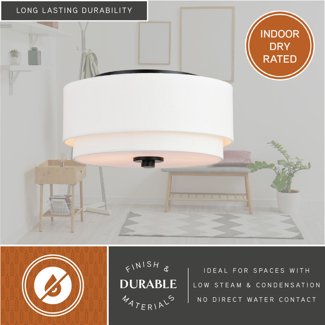 Keyword:120 Volts Black Ceiling Dining Room Drum Fabric Fixture Hallway Hardwired Indoor Interior LED Compatible Lighting MCM Metal Mid-Century Modern Mount Round Semi Flush Transitional White