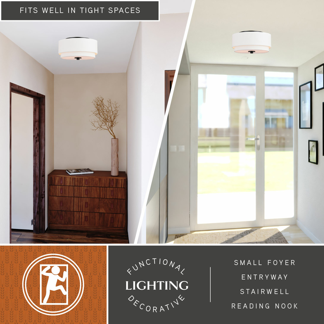 Indulge your mid-century modern dreams with this timeless collection. The Burnaby collection brings an undeniably contemporary feel to your modern interiors with its interplay of linen and black. This flush mount ceiling light is perfect for a low ceiling foyer, living room, hallway, entryway, or bedroom. Its soft Mid-century modern style is enhanced by a white linen drum shade. A white acrylic diffuser hides the bulbs and softens the light distribution.