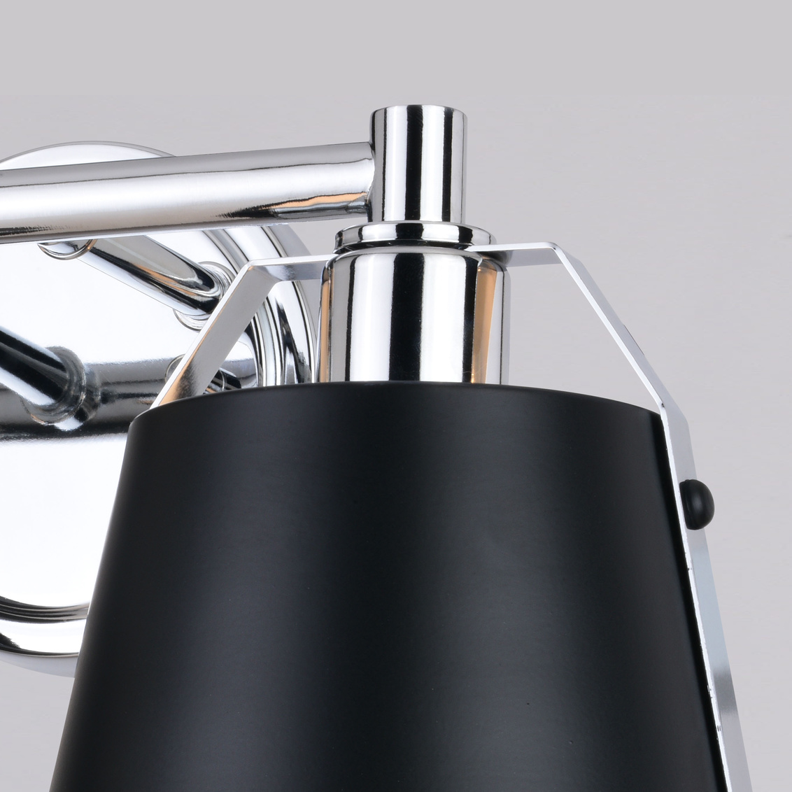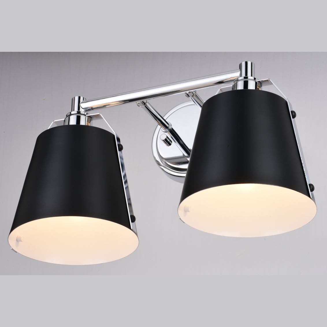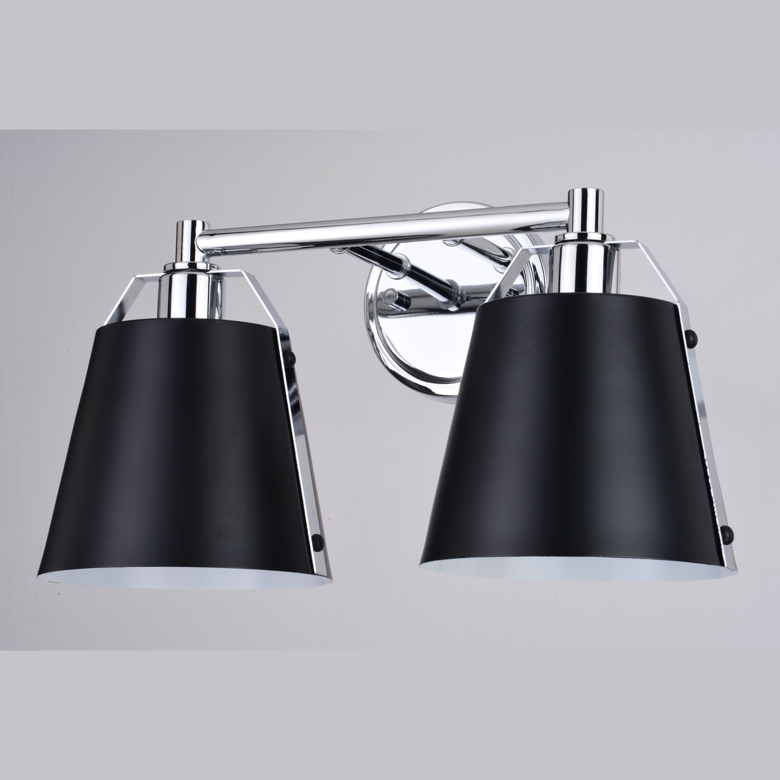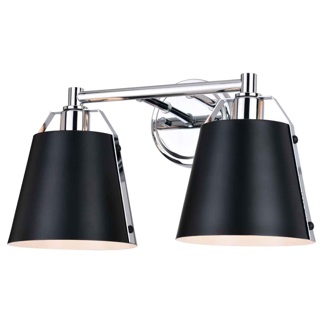 A sophisticated blend of contemporary and industrial styles, the Barrington collection is all about the finer details. Tapered matte black metal shades suspend from a slim rod with riveted chrome straps. The white interior finish and up-down lighting features of the open top shades provide the optimal light output. This bathroom vanity light is ideal for a variety of areas including the bath and kitchen or anywhere there is a need for extra light.