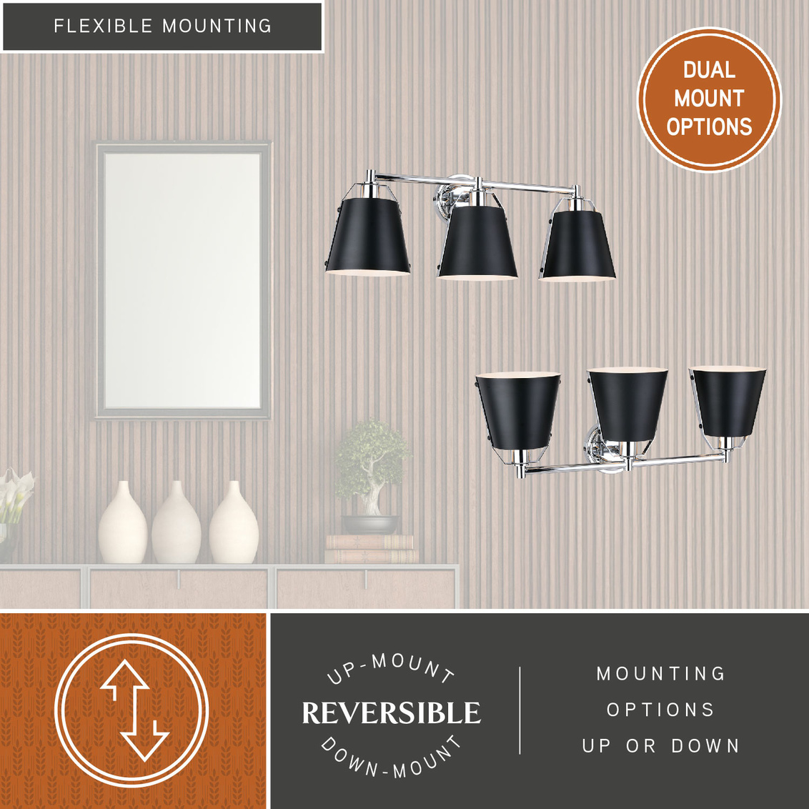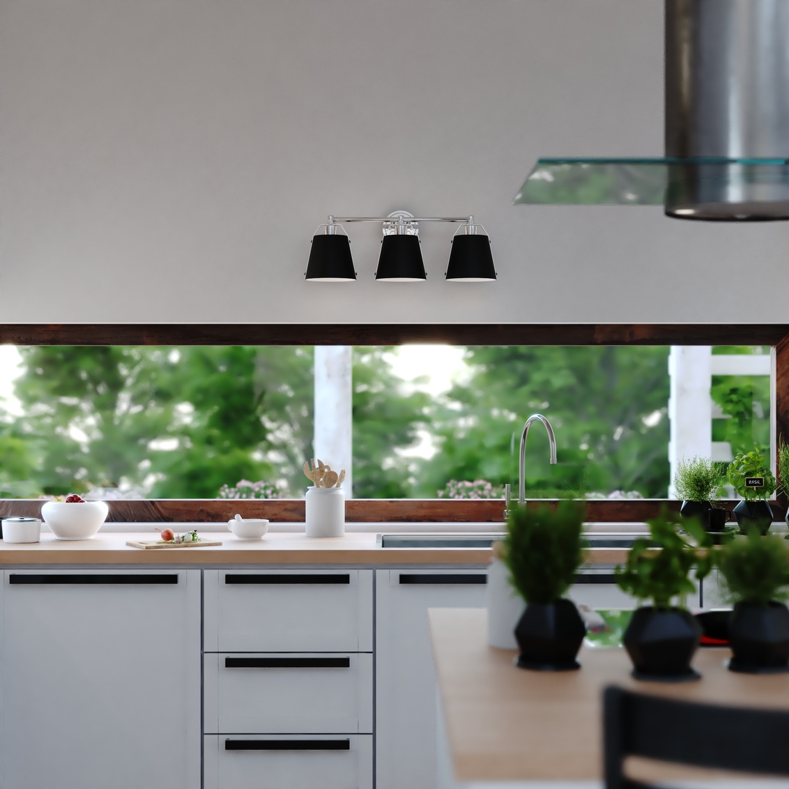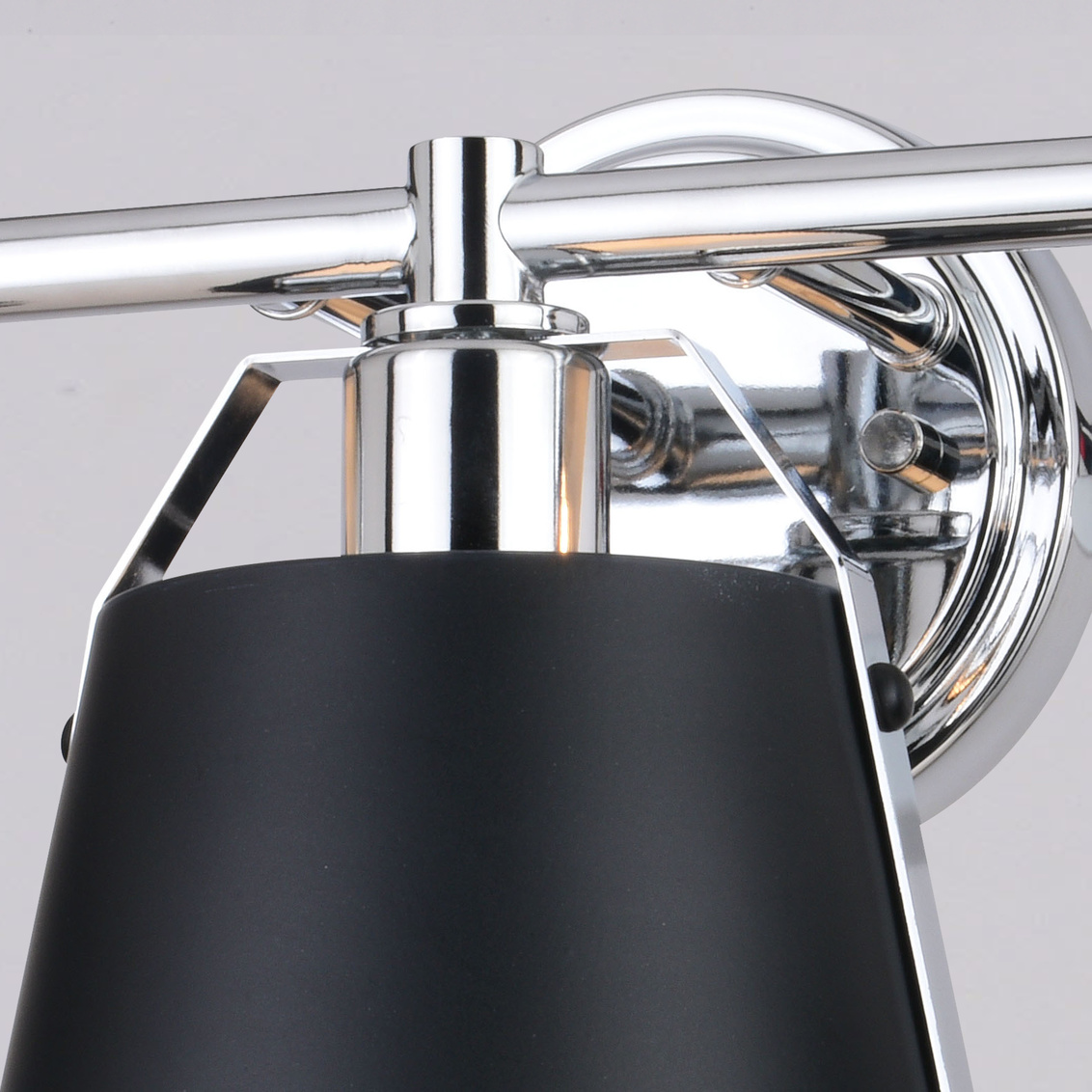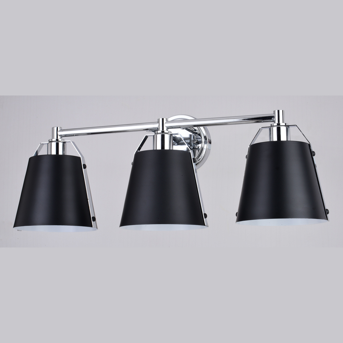 A sophisticated blend of contemporary and industrial styles, the Barrington collection is all about the finer details. Tapered matte black metal shades suspend from a slim rod with riveted chrome straps. The white interior finish and up-down lighting features of the open top shades provide the optimal light output. This bathroom vanity light is ideal for a variety of areas including the bath and kitchen or anywhere there is a need for extra light.