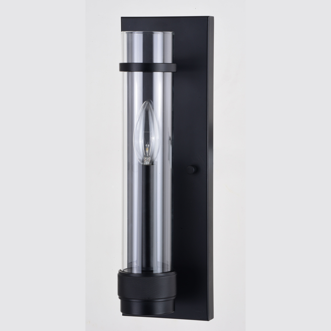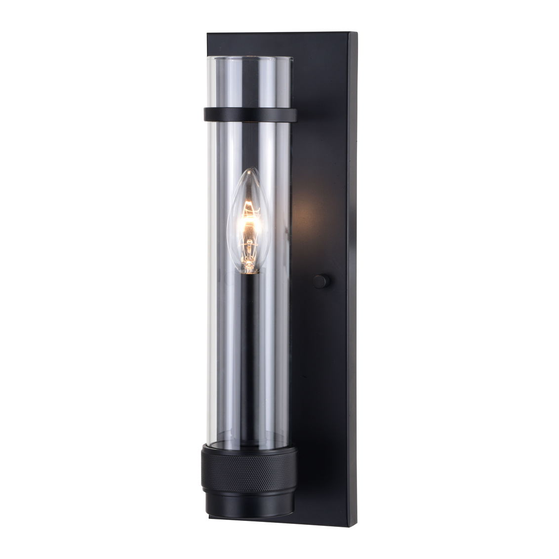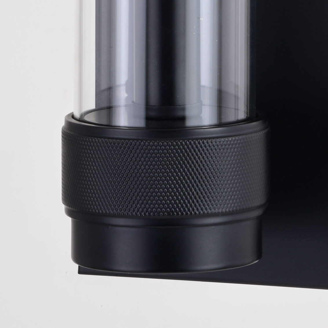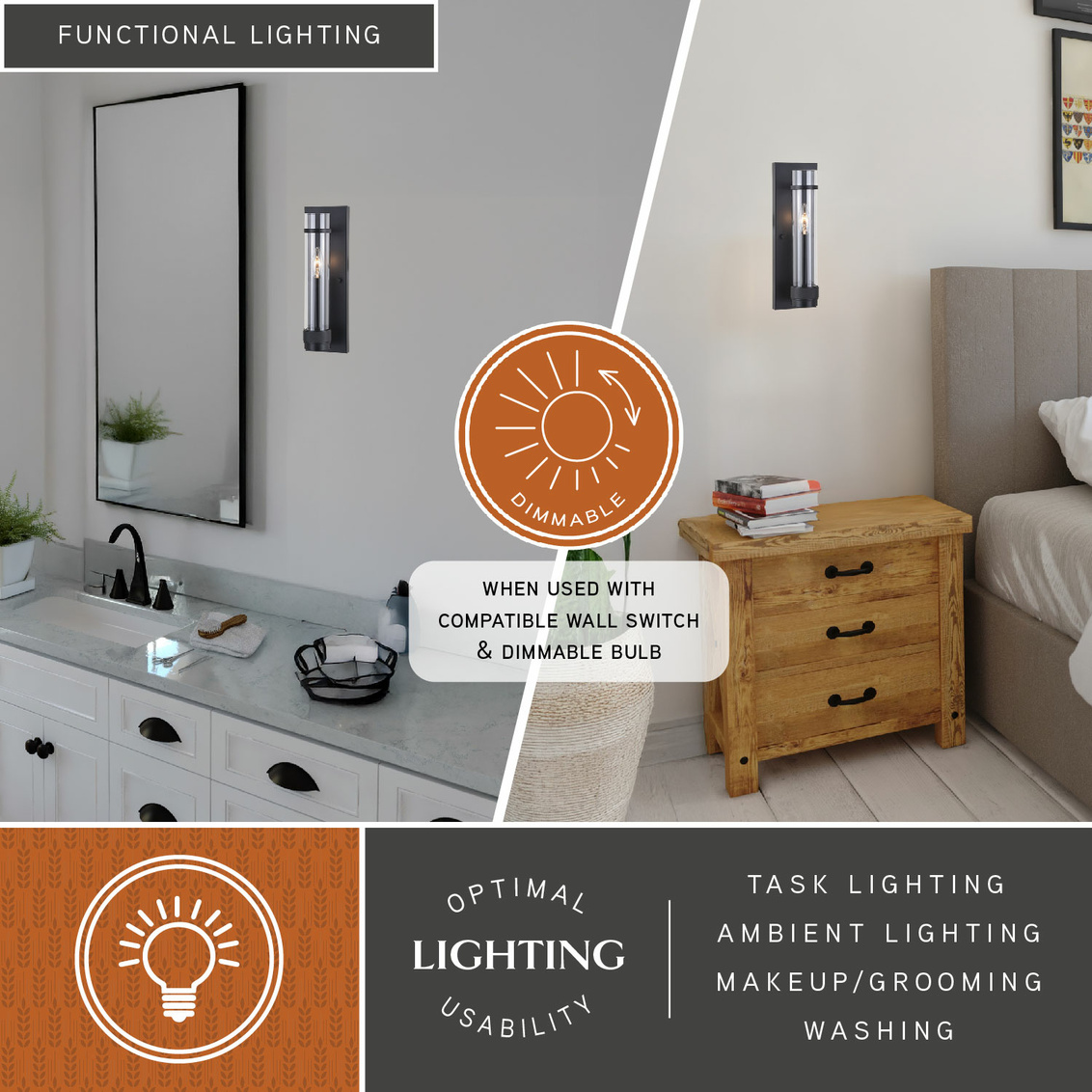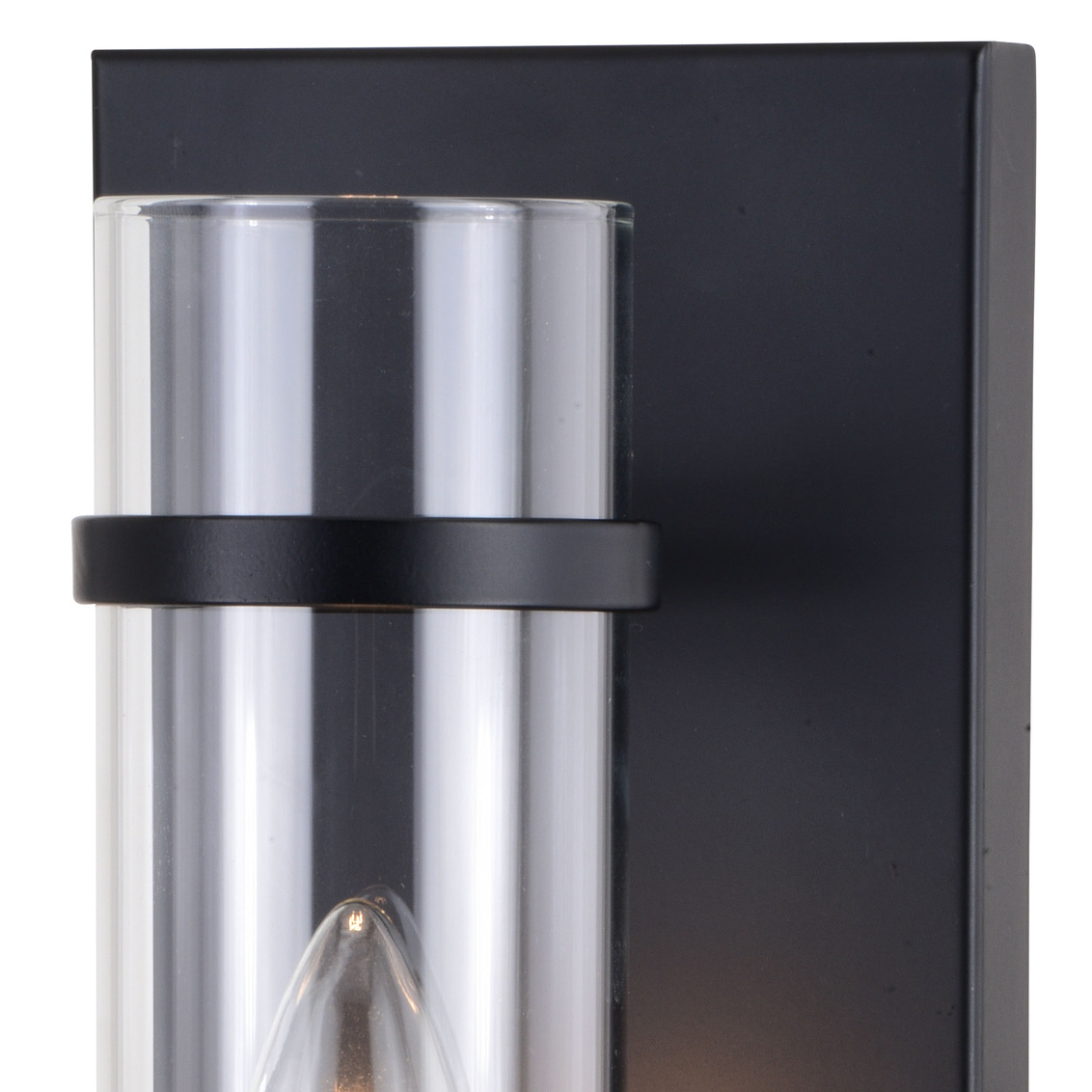 Keyword:Bath Bathroom Light Black Candelabra Clear Contemporary Cylinder Damp Fixture Full Back Plate Glass Indoor Interior LED Compatible Lighting Matte Mount Sconce Transitional Vertical Wall