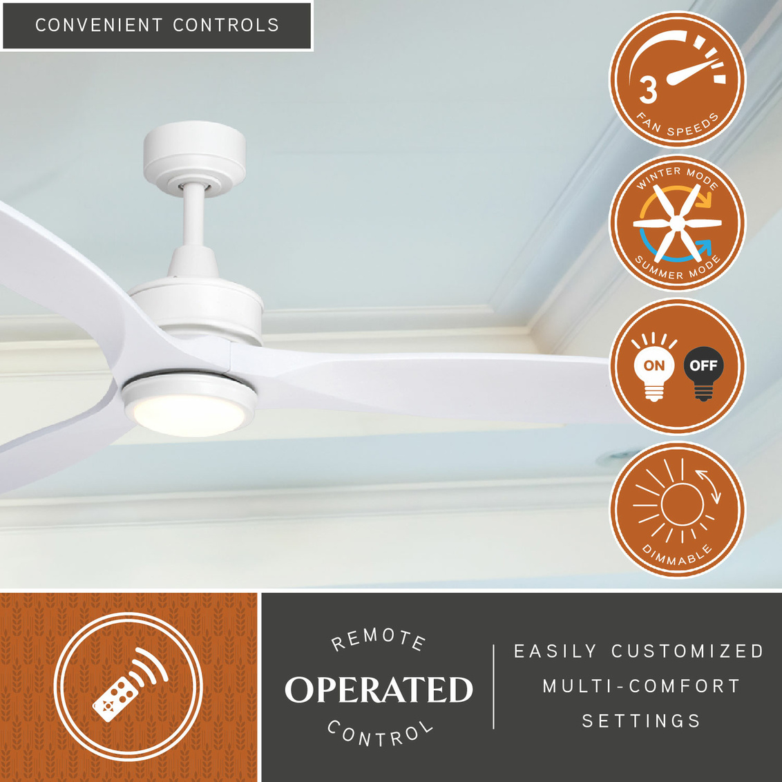 The white on white finish, hand carved solid wood blades, and clean lines give the Curtiss ceiling fan its on-trend contemporary look. This fan is compatible with sloped ceilings and includes a 6 inch downrod (longer down rods sold separately). Exterior damp rated, ideal for indoor or outdoor spaces such as entryway, family room, bedroom, bathroom, living room, kitchen, or covered outdoor porches. Remote control included for added convenience. An integrated LED light kit provides energy savings, low maintenance and long-lasting performance.
