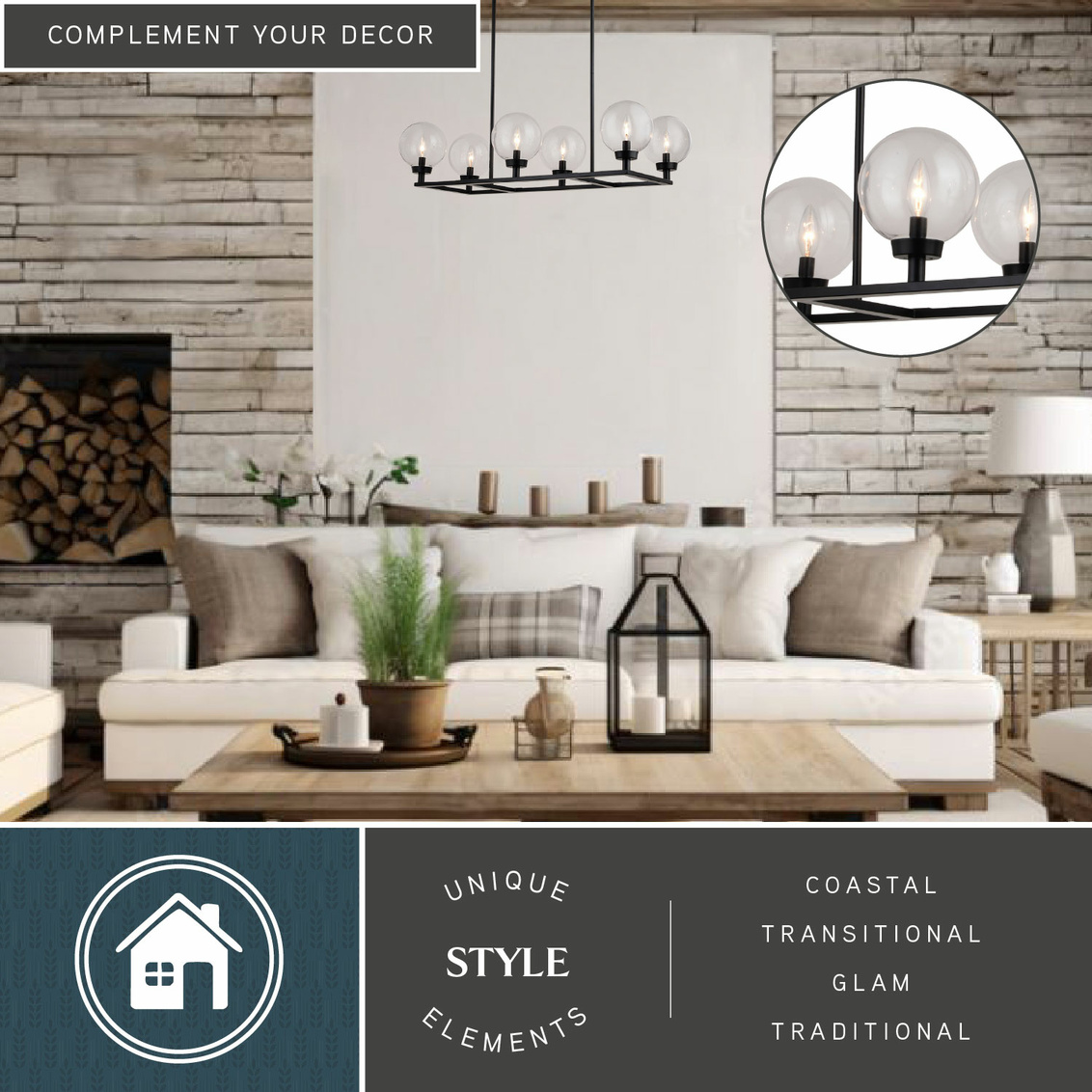 The Lander indoor lighting collection is contemporary style with flair. Distinctive arms finished in matte black support and highlight the clear glass globes. Hung with downrods suitable for vaulted ceilings, this linear chandelier is a perfect addition to your kitchen, dining area, or any other living area where a little extra style is desired.
