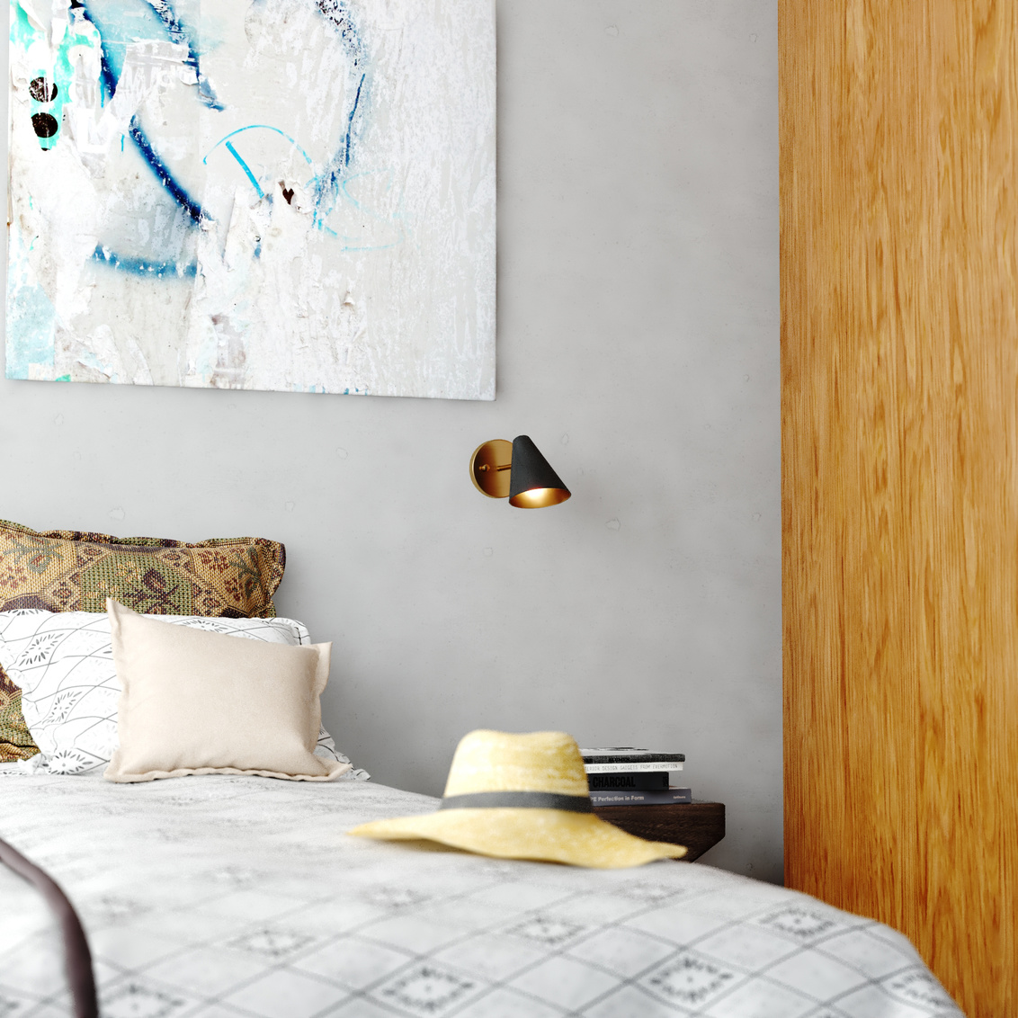 A sophisticated blend of mid-century modern with contemporary styling, the Pryce interior lighting collection is all about the finer details. A tapered matte black metal shade suspends from a slim gold satin brass arm. This indoor wall lamp is ideal for a variety of areas including the bathroom vanity, hallway, kitchen, bedside, or anywhere there is a need for extra light.