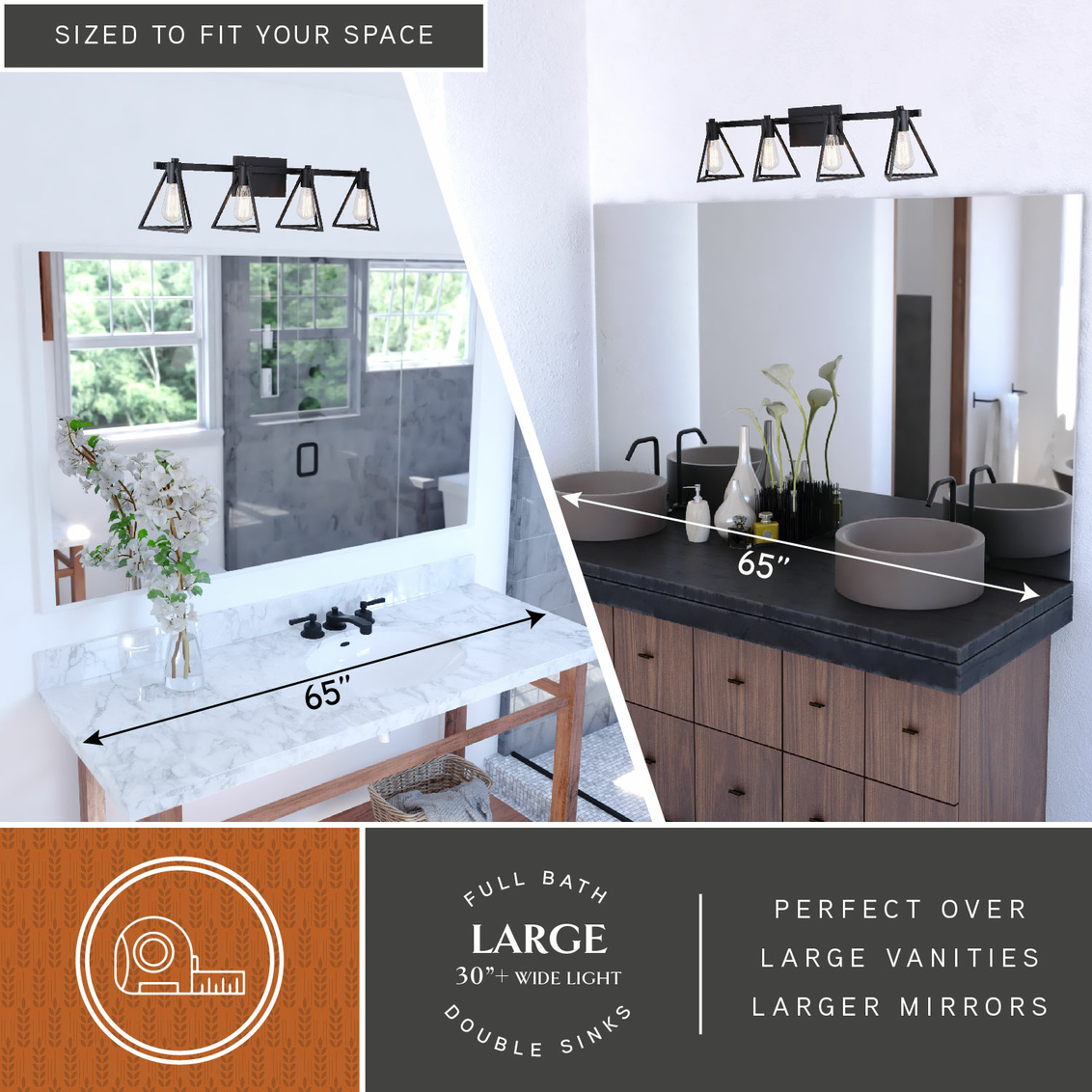 The Ravenna collection is the perfect update for any bath space. The matte black finish and geometric metal cage make a bold statement. The large backplate enables flexibility of installation for an off-center electrical box. This four light version is sized right for over large or double vanities where there is only one outlet box. Add this vanity light for any bathroom and will become the focal point of the space.