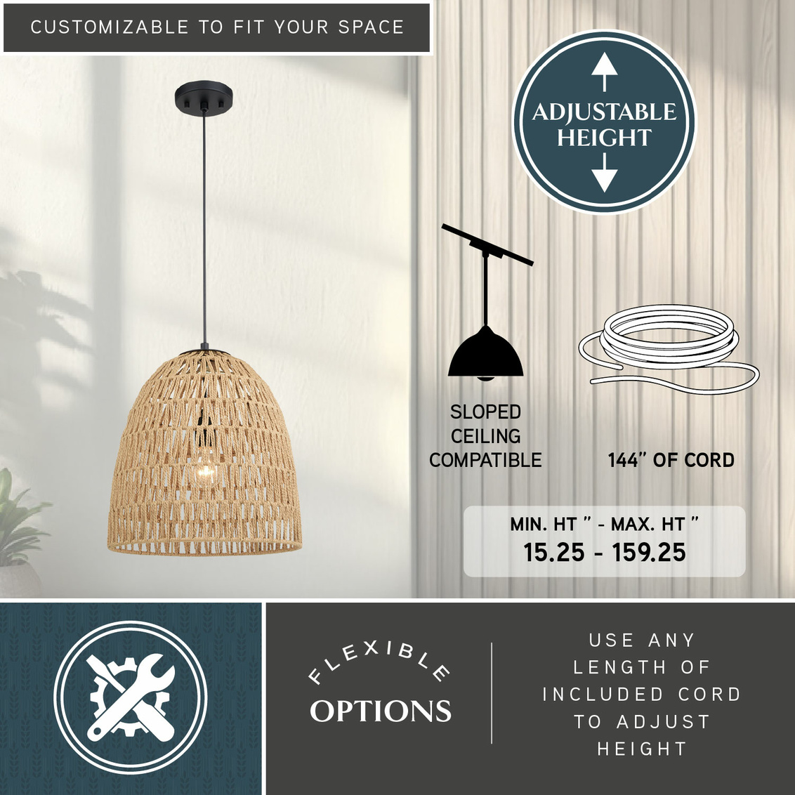 Keyword:Adjustable Angled Ceiling Basket Bedroom Beige Black Coastal Cord Dining Room Dome Fixture Hanging Interior Kitchen Island Large LED Compatible Lighting Living Matte Mount Natural Pendant Light Rope Sloped Steel Table Transitional Vaulted