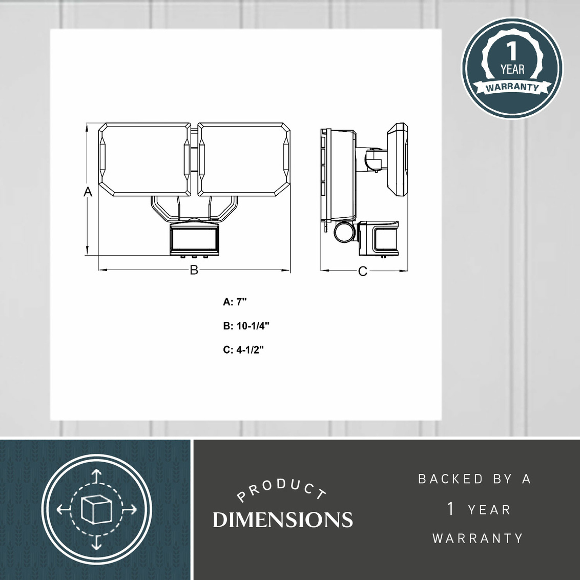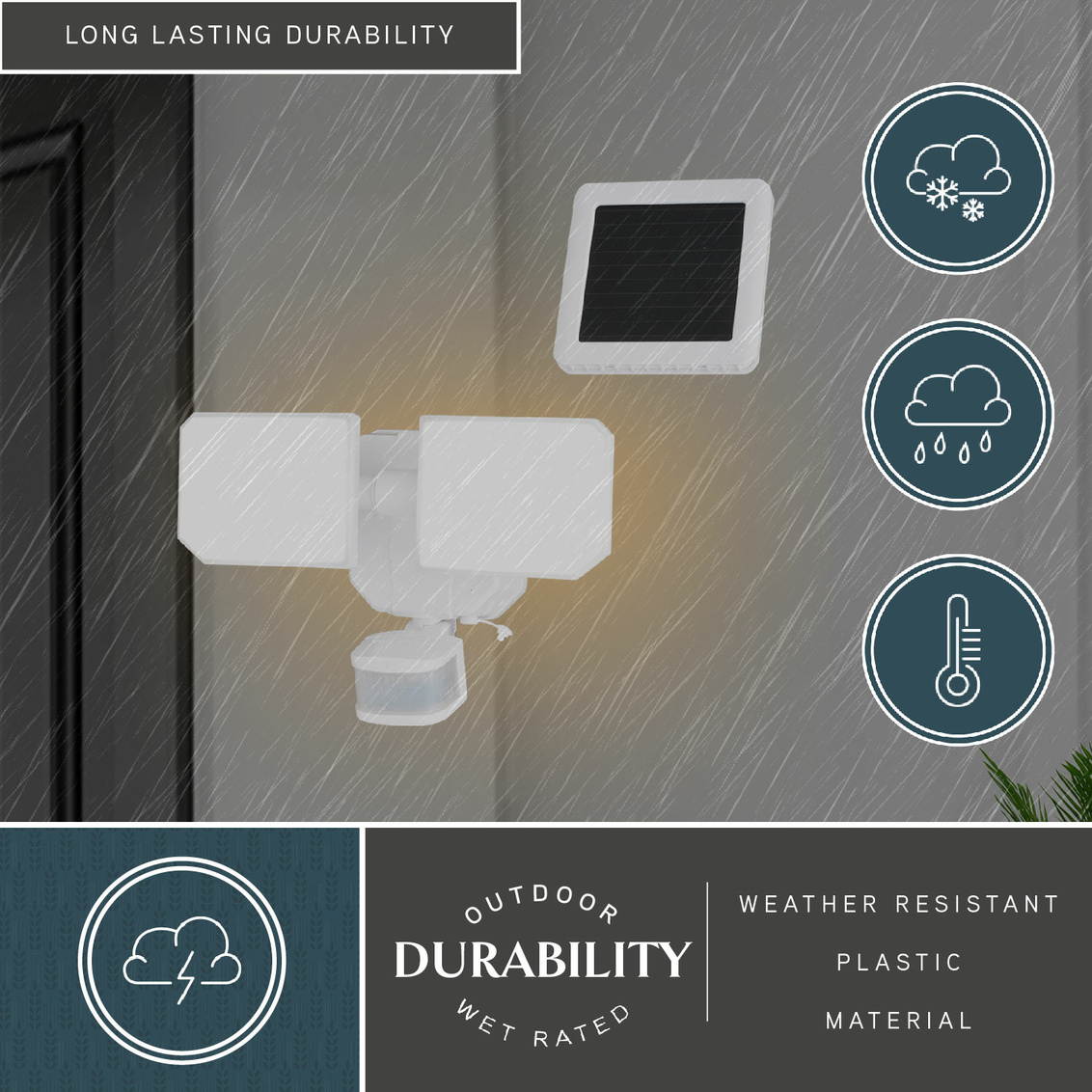 This 2-light integrated LED solar outdoor motion sensor security light provides dual-level lighting: ambient 2700K low-level lighting overnight and 5000K full brightness high level when motion is detected. The light heads and sensor are fully adjustable and automatically deliver 1800 lumens to illuminate your home’s exterior with warm ambient light at dusk, then instantly brighten when motion is detected. The included solar panel is equipped with a 16 foot connecting wire to allow for positioning in maximum sunlight for solar power or optional battery backup power with 3 x 1.5V C-Type Alkaline batteries (not included) keeps your lights powered no matter the weather. Customize your lighting options with 2 modes of operation plus adjustable motion sensor sensitivity. Suitable for wall or eave mounting with a wide 240 degree detection area and up to 50 feet. This Dualux security flood light expands the functionality, safety, and security of your home’s outdoor spaces with bright, reliable light when and where it’s needed.
