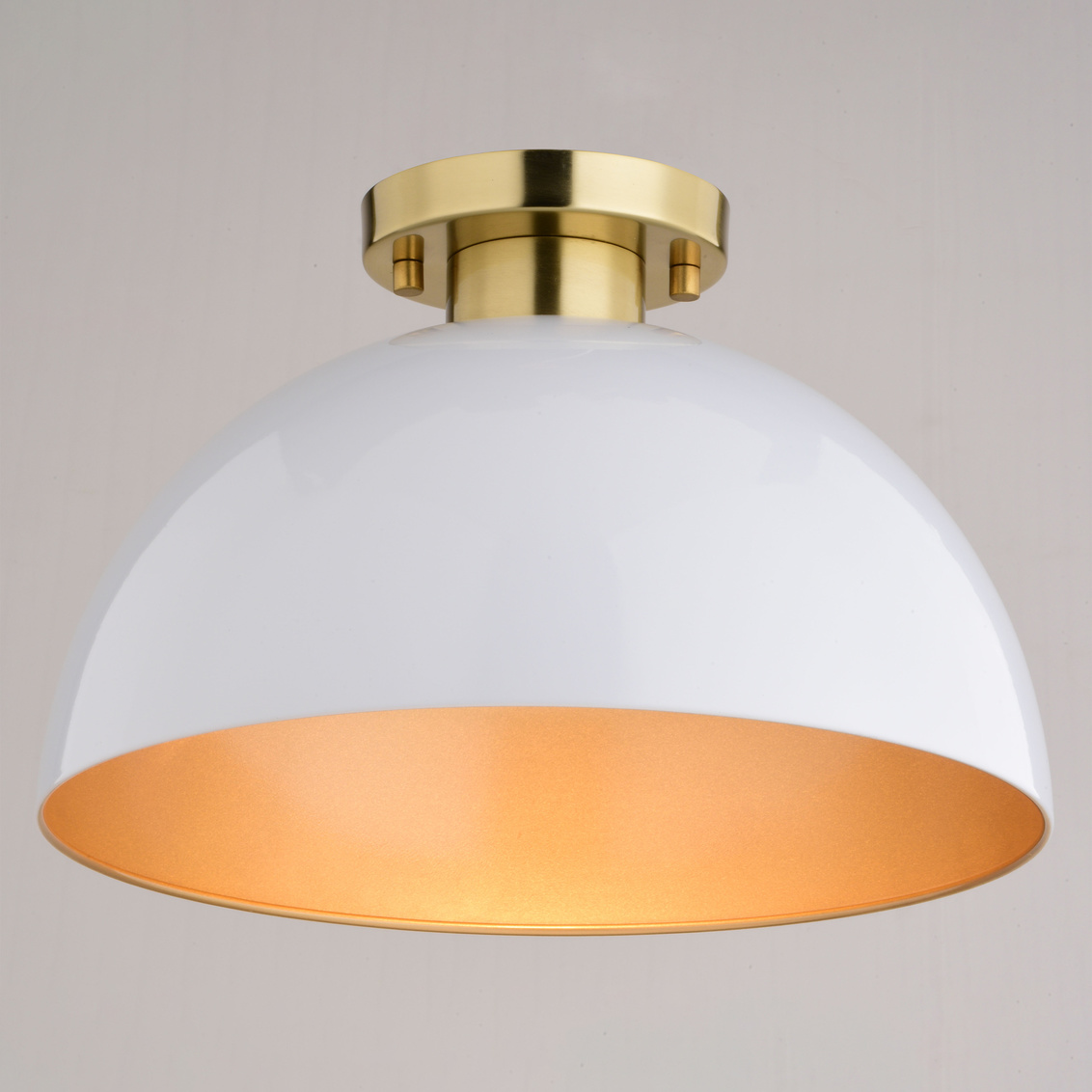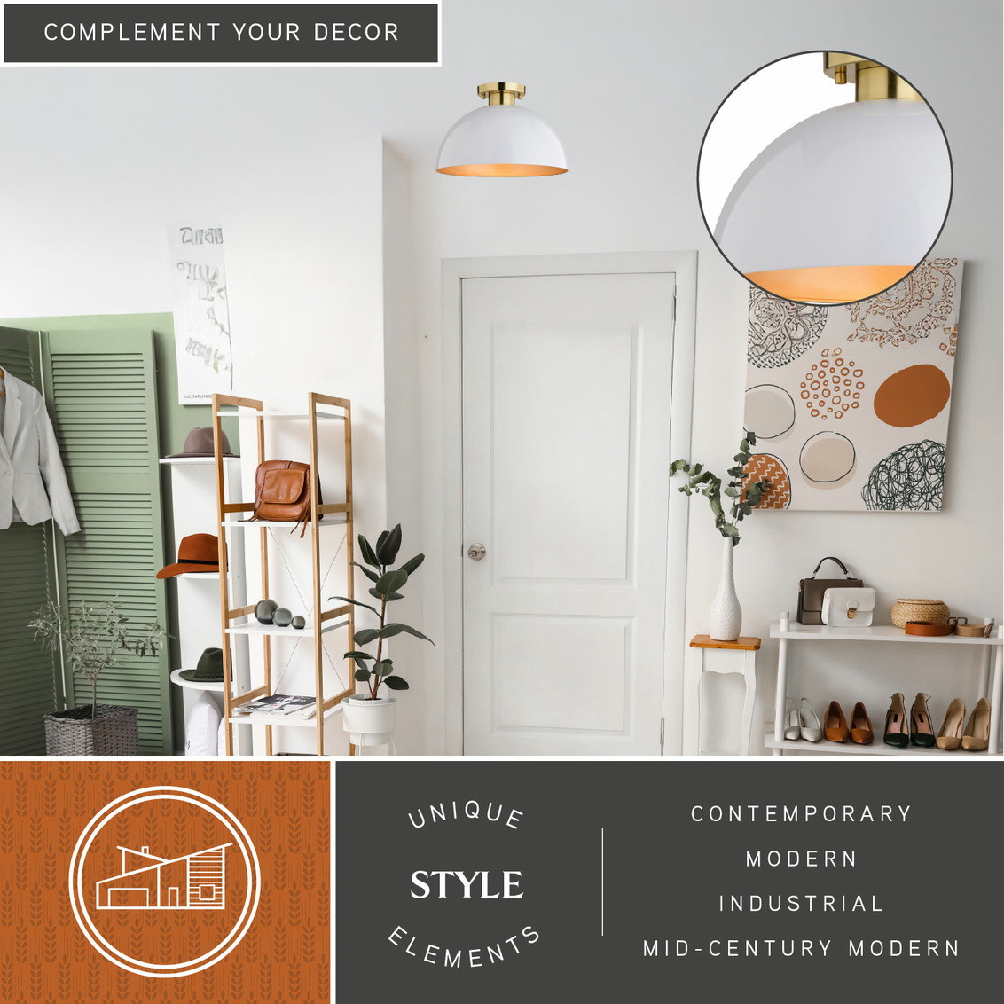 The Devon collection showcases a ceiling light that exudes elegance and simplicity at a great price point. The classic glossy white dome shape is complemented beautifully by gold satin brass accents which adds a luxe touch to the overall design. The golden interior casts a soft glow of focused light and shows off the light's blend of modern minimalism and classic elegance. This ceiling light works well with many mid-century modern and contemporary decors whether it’s your kitchen, breakfast nook, home office or entryway.