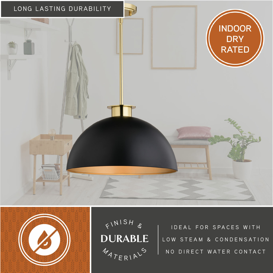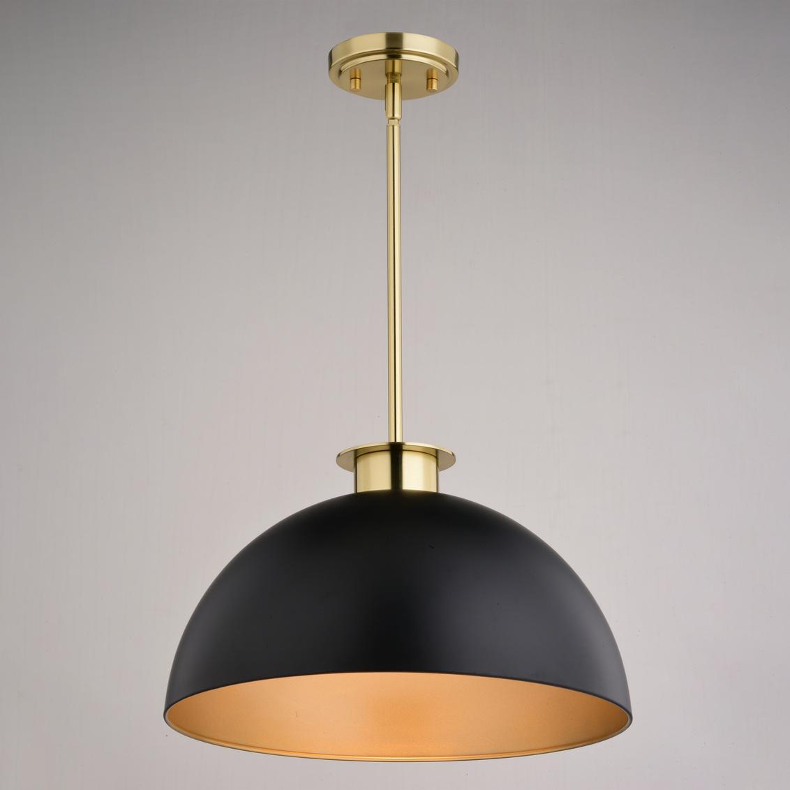The Devon collection showcases a ceiling light that exudes elegance and simplicity at a great price point. The classic matte black dome shape is complemented beautifully by gold satin brass accents which adds a luxe touch to the overall design. The golden interior casts a soft glow of focused light and shows off the light's blend of modern minimalism and classic elegance. This pendant works well with many mid-century modern and contemporary decors whether it’s your kitchen, breakfast nook, home office or entryway.