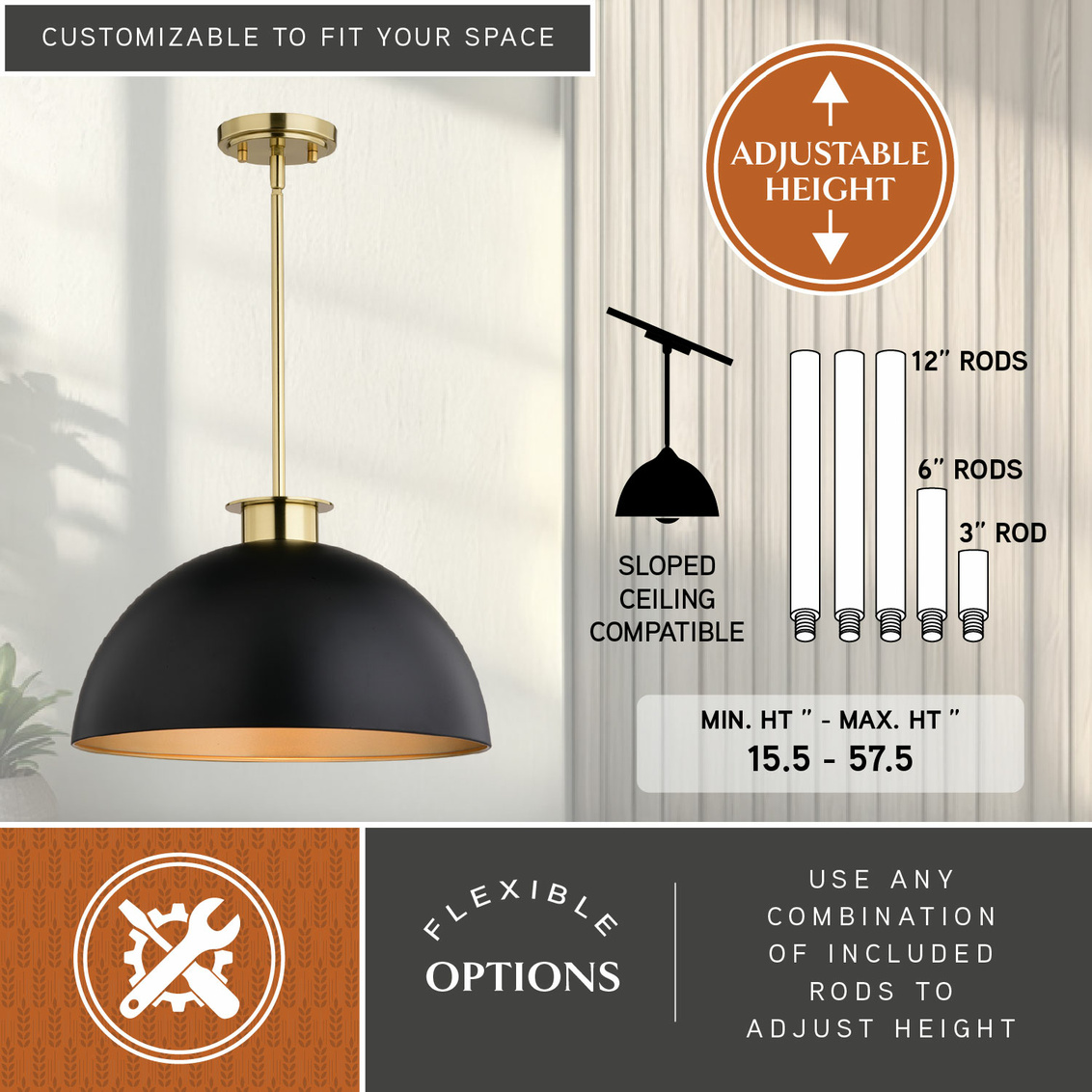 Keyword:Adjustable Angled Ceiling Bar Area Bedroom Black Brass Contemporary Dimmable Dome Down Rod Downrod Fixture Gold Hanging Indoor Interior Kitchen Island LED Compatible Lighting Matte Metal Shade Mid-Century Modern Mount Pendant Light Satin Sloped Steel