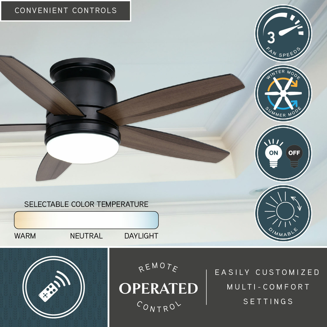 The low-profile 44-in. Armon ceiling fan adds minimalist design and maximum comfort to your modern interior. Its black housing accented by reversible black or brown hickory blades, effortlessly blends style with functionality. Enjoy customizable LED illumination and comfort settings all at your fingertips via remote control. Backed by ETL safety certifications and a lifetime limited warranty, the Armon fan is a stylish and reliable choice for your home.