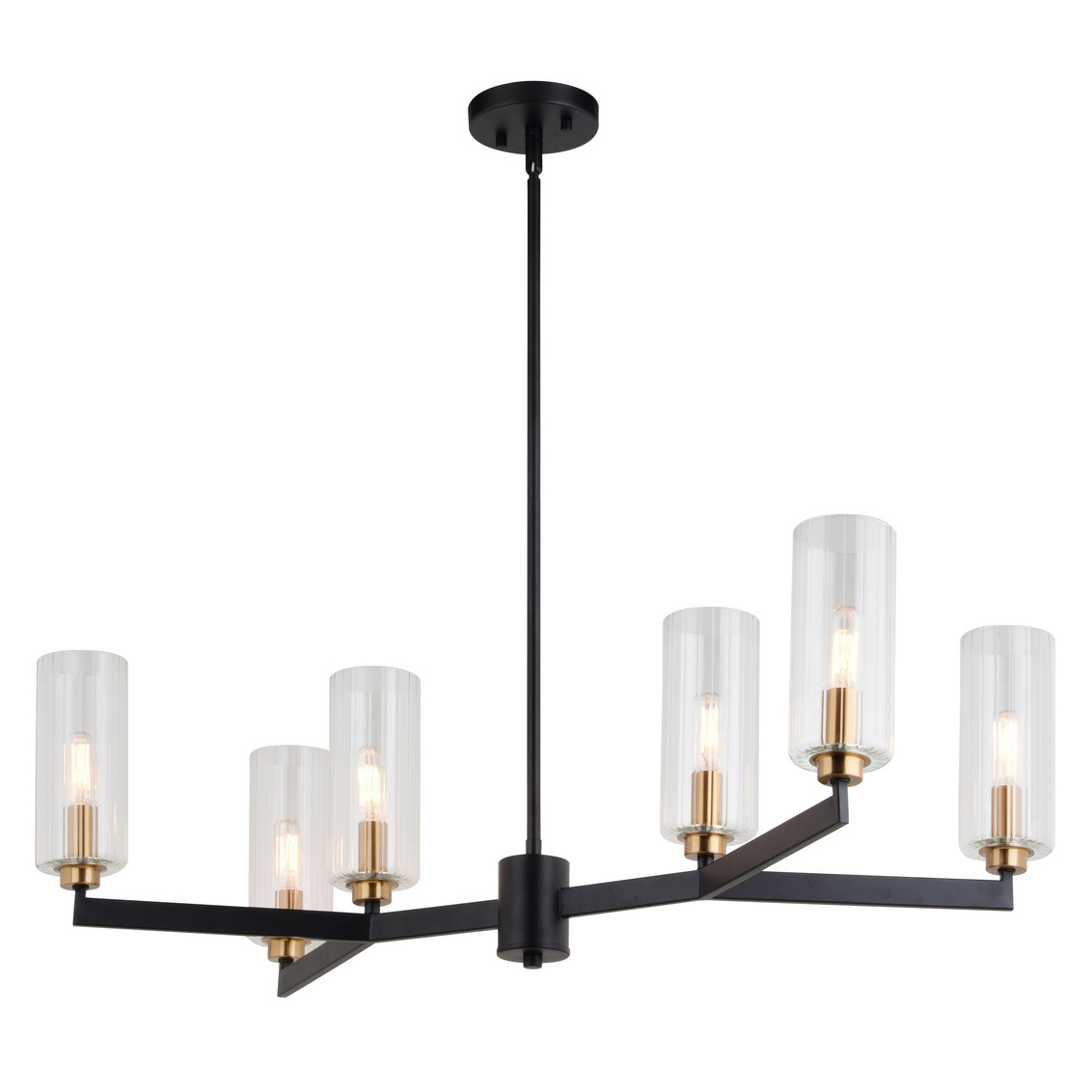Bring elegance to your dining room or kitchen island with the Claremont chandelier's contemporary yet transitional touch. Its branching frame, clear ribbed glass shades, and two-tone finish create a perfect blend of style and functionality. Add vintage-style Edison bulbs for a touch of nostalgic charm and a warm inviting glow.