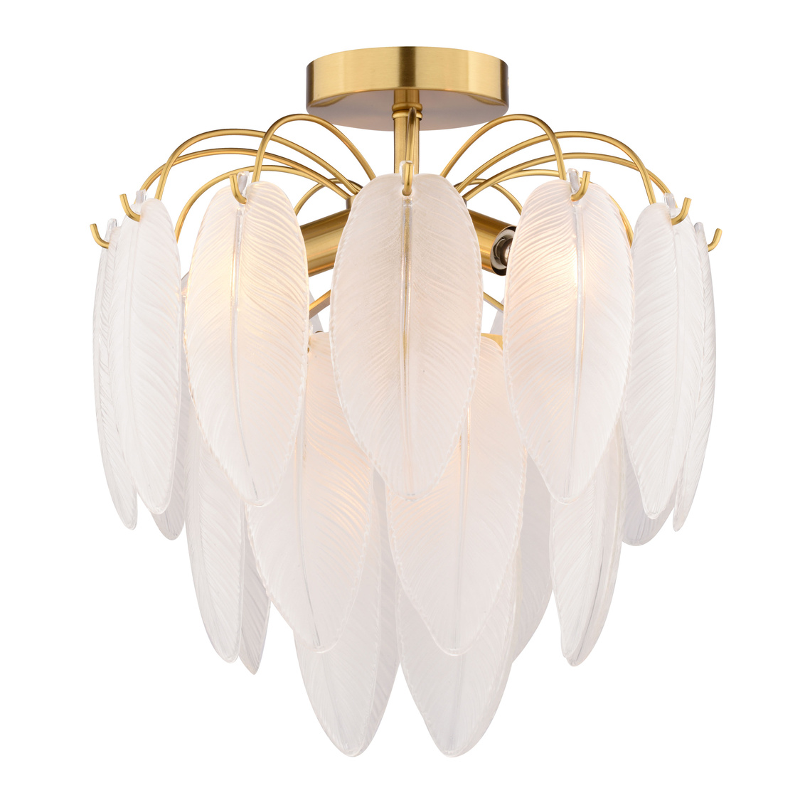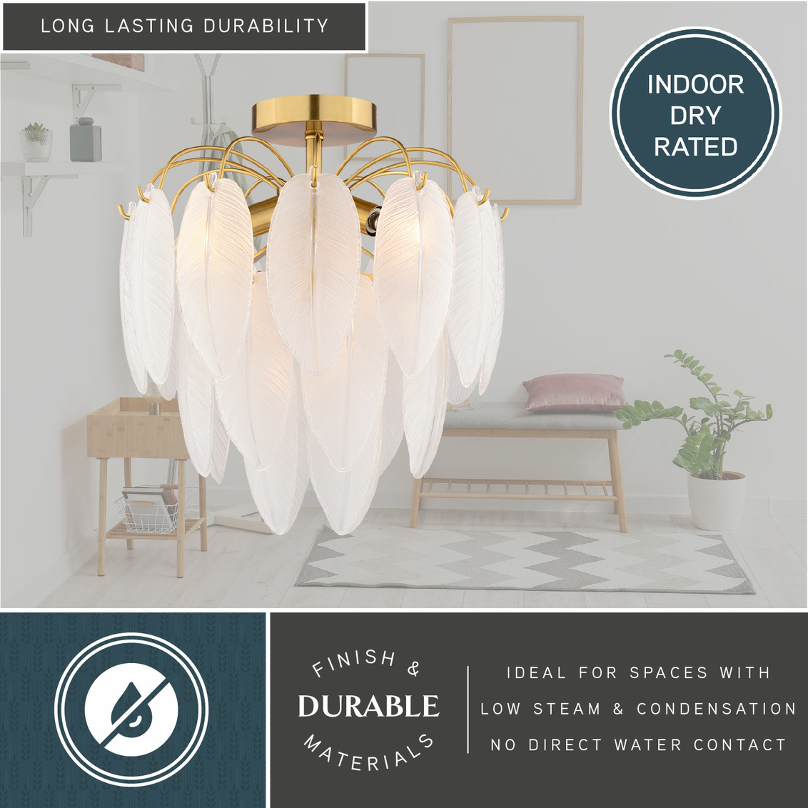 Channel the allure of the art deco era with the Burbank 4-light semi-flush mount in an elegant muted gold finish. The frosted, textured leaf glass creates a warm, inviting glow, showcasing high-quality craftsmanship with its substantial, sculptural design. This ceiling fixture's unique, hanging leaf motif adds a touch of vintage glamour, making it a stunning focal point in entryways, dining rooms, or living spaces. Embrace the timeless charm of art deco design and elevate your home's decor with the Burbank collection.