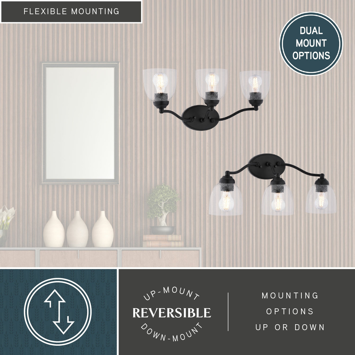 Transform your bathroom's ambiance with the Bellwood 3-light vanity, a perfect blend of classic design and modern sophistication. The matte black finish provides a timeless feel, while the clear seeded glass shades add a touch of vintage charm, diffusing a warm, inviting light. This wall light reimagines traditional style with thoughtfully updated details, including classic sphere accents and graceful tulip glass shades. Damp-rated for lasting performance, the Bellwood vanity is designed to withstand the moisture of bathroom environments. Enhance your daily routine with a fixture that seamlessly bridges traditional charm and modern functionality.