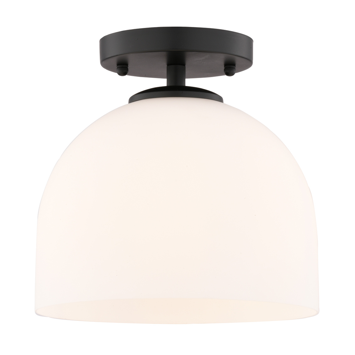 Illuminate your bedroom, bathroom, entryway, or hallway with the Shelby 1-light semi-flush mount celing light. Its classic design and matte black finish add a touch of timeless sophistication for both transitional and contemporary spaces. The elongated white dome-shaped glass shade emits a soft, diffused light, creating a warm and inviting atmosphere in any space.